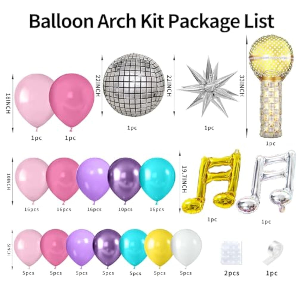| Packaging Includes:This Set Includes18-Inch-1×Maca Pink,1×Pink;10-Inch-16×Maca Pink,16×Pink,16× Purple,10×Metallic Purple,16×Teal Blue;5-Inch-5×Maca Pink,5×Pink,5×Purple,5×Metallic Purple,5×Teal Blue,5×Yellow,5×White;1X 22 Inch Disco Ball, 1X Silver Exploding Stars,3X Musical Note Foil Balloon,Along With A Balloon Strip And 2 Rolls Of Balloon Dispensing. | | Premium Latex Balloons:Made From Premium Latex,These Pink Purple Balloons Are Designed To Be Long-Lasting And Resistant To Bursting.These Disco Balloon Arch Kit Are Ideal For Any Event.The Balloon Garland Kit Is Suitable For Both Adults And Children,Ensuring A Fun And Reliable Decoration Option For Your Celebrations. | | Applicable Occasions:Balloons Are A Ideal Choice Birthday Parties,Disco Parties,Weddings, Graduations,Baby Showers,Christmas,Halloween,Festivals,Engagements,Anniversaries, And More.They Add A Festive Touch To Any Event And Are Sure To Create Lasting Memories With Your Family And Friends.These Latex Balloons Make For A Delightful Decoration That Suits Any Occasion. | | Easy To Assemble:No Experience Needed!Simply Inflate The Balloons With Helium Or An Air Pump, And Use The Included Glue To Assemble Them Into A Stunning Arch.If Your Kit Includes Confetti Balloons,Gently Rub Them On Your Hair Or Carpet To Help The Confetti Stick For Added Sparkle! | | Cautions And Warnings:To Ensure Safety And Durability,Avoid Inflating The Balloon Beyond 90% To Prevent Unexpected Popping.Additionally,Keep The Balloon Away From Direct Sunlight,Excessive Heat,Sharp Objects,And Rough Surfaces To Maintain Its Quality And Performance. | |