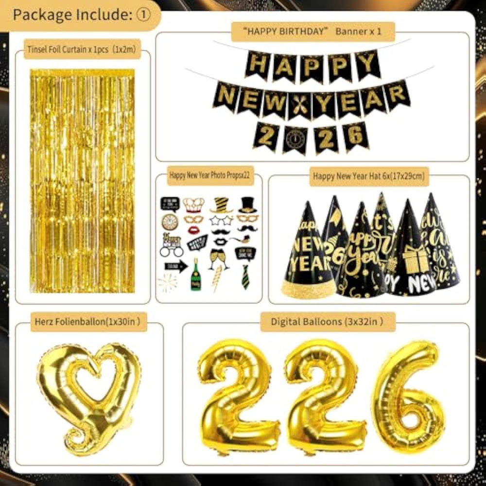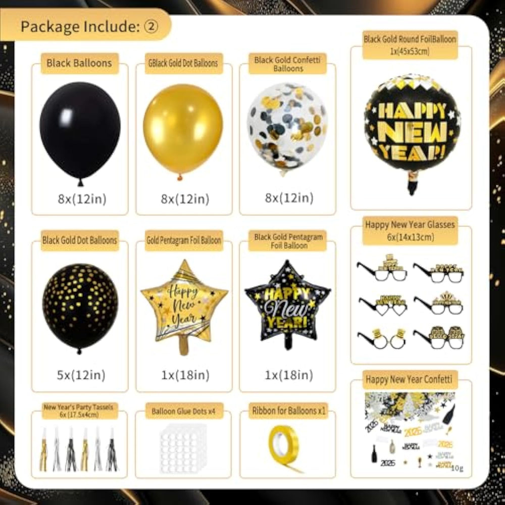 | Black Gold 2026 New Year'S Eve Party Decorations: Black And Gold 2026 Happy New Year Decorations Includes 1 Set Happy New Year Banner, 1 Set "226" Large Gold Foil Balloons 32", 1* Large Heart-Shaped Foil Balloon 30", 1 Set 2026 New Years Photo Props, 1* Gold Curtains, 8* Black Balloons 12", 8* Gold Balloons 12", 8* Black Gold Confetti Balloons 12", 5* Black Gold Dot Balloons 12", 6* Hats, 6* Glasses, 6* Blowouts, 2* Five Pointed Star Foil Balloons 18", 1* Round Happy New Year Foil Balloon, 1* Champagne Bottles Foil Balloons, 1* Happy New Year Confetti 10G, 4* Glue, 1* Gold Band. | | Durable Material: Balloons Made Of Natural Non-Toxic Latex And High Quality Aluminium Foil, Strong And Durable, Do Not Burst Easily, Confetti Balloons Are Pre-Filled With Shiny, Black Gold Confetti Which Creates An Amazing Atmosphere When Inflated! The Banners Are Made Of Quality Cards And Can Be Reused! All-In-One Decoration Kit, Super-Rich 2026 Happy New Year Party Decorations To Make Your Celebration Really Shine! | | Easy To Assemble: Unravel The Entire 2026 New Years Set Diy Your Own 2026 Happy New Year Balloons Flower Ring, We Deliver Balloon Band And Point Adhesive To Help You Manufacture Balloons Arches. Hang The Happy New Year Banner On The High Place As The Decoration Of The Door Or The Background Of The Photo, And Let The Colorful Balloons Fly High. Just Add Some Imagination To Create Your Own Unique New Year Party. Whether At School, University, Office Or Home, It Is An Ideal Choice For Decorating New Year'S Eve Parties. | | Noble Black Gold 2026 New Year Party Decorations: We Provides You With A Complete 2026 New Year Decoration Kit, Black Gold Happy New Year Banners, Gold 2026 Foil Balloons, Black, Gold And Multicolored Latex Balloons And 2026 New Year Decorations Studio Props. Take A Group Photo With Friends And Family In 2026 To Celebrate The New Year'S Eve In 2026, Indulge In The Luxurious Quality Of Our Black Gold Silver Happy New Year Decorations, Meticulously Crafted To Add Unparalleled Elegance To Your Special Day. | | 100% Excellent Service: We Stand Unwavering Behind The Quality Of Our Products, Assuring A Flawless Celebration. If Your Black Gold New Years Eve Party Supplies 2026 Set Arrives With Missing Or Damaged Pieces, We Are Committed To Offering A Free Replacement Pack. Trust Us To Ensure Your New Year Celebration Remains Flawlessly Elegant And Memorable With Our High-Quality And Inclusive New Year Decorations. | |
