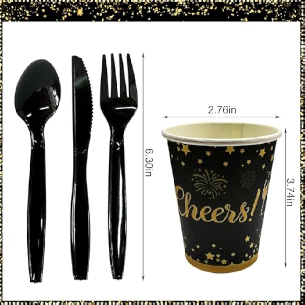 | 2026 New Years Party: Our 2026 New Years Eve Party Supplies Are Carefully Designed, New Year'S Eve Party Paper Plates Printed With Wine Glass Patterns, Balloons And Firework Patterns, New Years Party Table Cover Printed With Gold Stamping Star, Gold Dot Patterns, Perfect For New Year Eve Gathering Decoration Supplies, Add More Festive Atmosphere! These Black And Gold Dinnerware Set Can Meet 20 Persons Needs, Make Your New Year Eve Party Dinner Experience Impressive! | | Package Included: 20 Paper Plate Diameter (9Inch / 22.86Cm); 20 Napkins (12.59Inch / 32Cm); 20 Cups (266 Ml); 20 Spoons (5.7Inch / 14.5Cm); 20 Forks (5.9Inch / 15Cm); 20 Knives (6.69Inch / 17Cm). 1 Table Cloth (108In*54In); 1 Banner. Suitable For Small New Year Party, Enough Quantity To Meet Your Party Needs, You Just Only One Click To Get Everything You Need. | | High Quality: Plates, Cups And Napkins Are Made Of Eco-Friendly Biodegradable Paper, Our Plates Are Made Of Heavy-Duty Paper With 350G Paperboard Thicker Than Others With 250G-300G Paperboard In The Market, That Is Better Quality And Thicker So You Don'T Have To Worry About Bending Or Breaking. Ideal For Desserts, Food And Drinks. | | Save Your Time: This New Years Themed Party Set Is Perfect For A 2026 New Years Eve Celebration! Spend More Time With Your Guests As This Party Pack Contains All Of Your New Year Party Tableware Needs. No Wash Up! You Just Need To Throw Paper Cups, Table Cover, Utensils, Cutlery Bag, Napkins Into The Trash Can After The Party. | | Multiple Application: The Black And Gold Disposable Dinnerware Makes The Perfect Addition To Your New Year Party, Reunion And Anniversary, Holiday Party, Christmas Party, Birthday Party, Catering Event, Engagement Party, Weddings And All Other Occasions, An Elegant And Festive Decor Complement To Your New Years Eve Table Setting! | |