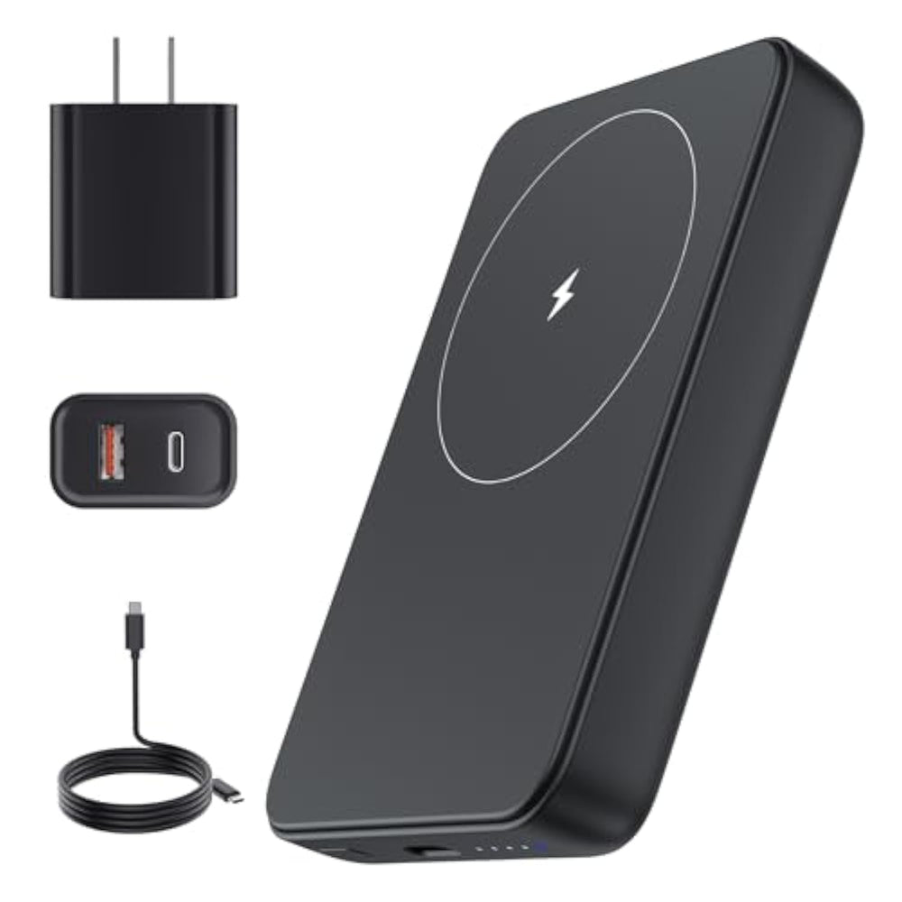 | Stronger Magnetic Connection: Built adventure-tier touch with superior durability and scratch resistance, the magnetic power bank for iphone is premium both inside and out.Equipped with ultra-strong magnets that firmly attach to the back of the iPhone 15 14 13 12 Pro/Pro Max/Plus/Mini. | | Slim Design,Big Power: The 5000 mah magnetic wireless power bank is small and slim enough so that it's equal to a battery phone case when the power bank sticks on the phone.The sleek and slim design allows you to single-handedly take