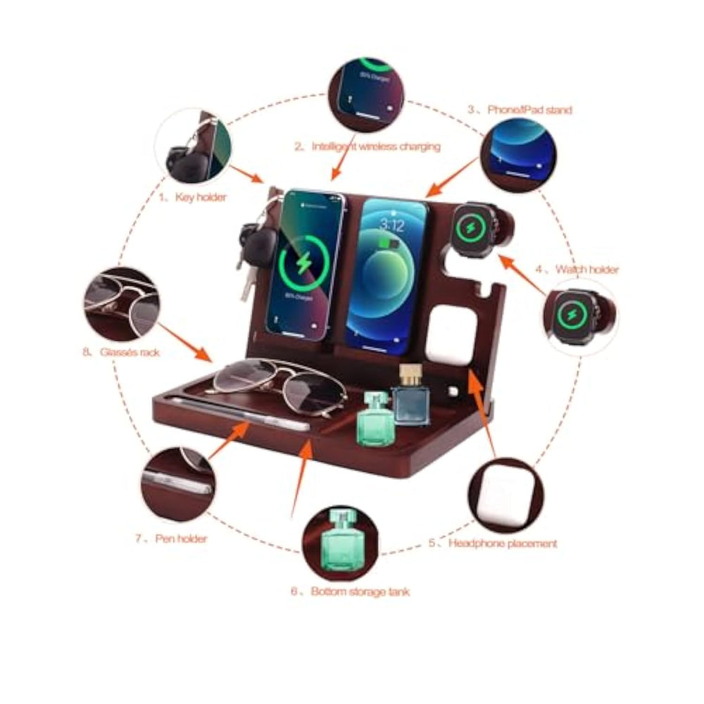 | ?Wireless Charging Station For Multiple Devices?Our Iphone And Watch Charging Station Features Wireless Charging Outputs, Supporting Simultaneous Charging Of Two Qi-Enabled Phones, A Tws Box, And An Iwatch. You Can Charge Up To Four Devices At Once. Unlike Many Electronic Organizer Lacking Wireless Charging Capabilities For Tech Gadgets, Ours Simplifies Charging β Simply Place Your Android Or Ios Phones, Iwatch, Or Airpods Box On The Station To Begin Charging.Plus, If Your Phone Doesn'T Support Wireless Charging, There'S A Backup Usb Port For Charging.(Pls Note That Watch Charger Only For Apple Watch) | | ?Multi-Functional Bedside Table Organizer?The Spacious Valet Tray Conveniently Organizes Essentials Like Wallets, Glasses, Watches, Keys, Fitness Trackers, And Other Accessories, Maximizing Space And Keeping Everything In One Place. The Top Plate Also Functions As A Tablet Or Ipad Stand, Making It Easy To Play Games, Video