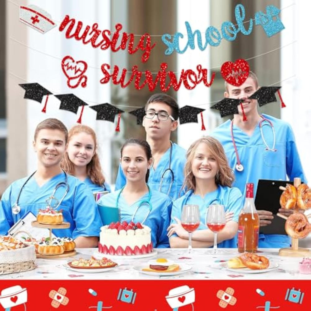 | 1... Nursing Graduation Party Supplies Glitter Nursing School Survivor Banner 2Pcs Congrats Nurses Banner, 1Pcs Graduation Cap Banner. The Gold Glitter Adds The Perfect Touch To Graduation Nurse Party Decorations. | | 2...Rn Graduation Party Decorations Are Made Of High-Quality Hard Cards With Glitter, Meet Your Quality Needs, Our Nurse Graduation Decorations Banner Is 9.8Feet Long When Unfolded, And A Single Card Is 6Inch Long And 5.1Inch Wide. It Has A Good Size And Will Bring A Different Experience To Your Rn Graduation Party Decorations. | | 3...Each Of Nursing Graduation Decorations Banner Needs To Be Assembled By Yourself, You Can Diy Them With Ropes And The Plastic Pin We Provide, You Can Also Match Other Decorations And Props At The Party, Which Offer A Nice Photo Backdrops , You And Your Banner Will Receive Many Compliments From Everyone. | | 4... The Unique Red And Blue "Nursing School Survivor Banner " Nurses Sign Design Adds A Medical Element To Our Nursing School Graduation Decorations. You Can Hang Nurse Graduation Party Supplies On The Fireplace Mantle, Window, Car, Dessert Table, Room, Garden, Yard Gate Or Anywhere You Want To Decorate At Home. | | 5...2024 Nurses Day Celebration - The Nursing Graduation Party Supplies Are Wonderful Photo Background, Great Party Decorations - These Nurse Theme Decoration Are Perfect For Nursing Theme Party, Medical Rn Nurse Theme Party, Nurse School Graduation Theme Party, Nurse Retirement, Baby Shower Theme Party, Birthday Party, They Can Bring The Fun To Your Party For Nurses Leaving Adorable And Unforgettable Memories For 2024 Nurses Day Celebration. | |
