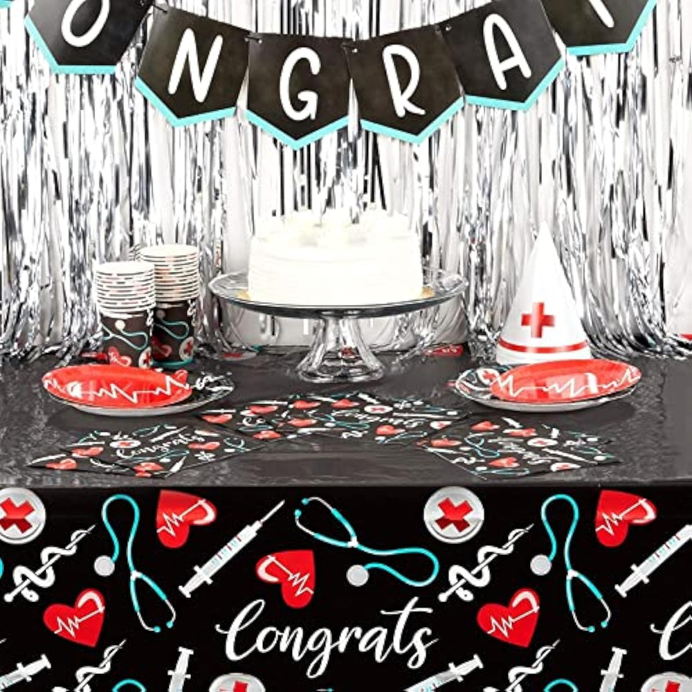 | Nursing Graduation Celebration: Celebrate Nursing School Graduation With Our Stylish Nursing Graduation Decorations. This Comprehensive Bulk Set Serves 24 Guests, Including Plates, Napkins, Hats, Table Covers, And A Banner, Totaling 123 Pieces | | Essential Dimensions For Party Supplies: Dinner Plates Are 9 Inches In Diameter, Appetizer Plates Measure 7 Inches, And Paper Cups Hold 9 Oz. Napkins Are 6.5 Inches, Hats Are 7X4 Inches, Table Covers Are 54 X 108 Inches, And Banner Panels Are 6 X 6 Inches | | Durable High Quality Materials: Crafted With Durability In Mind, Our Nursing Graduation Party Supplies Feature Thick, Rigid Plates To Prevent Folding And Soft, Absorbent Napkins. The Protective Plastic Tablecloths Ensure Long-Lasting Use For Your Celebration | | Memorable Nursing Party Decorations: Host An Unforgettable Event With These Vibrant Nursing Party Decorations, Perfect For Recent Nursing Grads, Those Celebrating Residency, Or Those Who Passed Their Nursing Exam, Adding A Festive Touch To Any Nursing Graduation | | Effortless Clean Up Experience: Enjoy The Convenience Of Easy Clean-Up With Our Nursing Graduation Party Supplies. Dispose Of The Tableware And Decorations After Use, Allowing You To Focus On Making Memorable Moments During Your Special Occasion | |