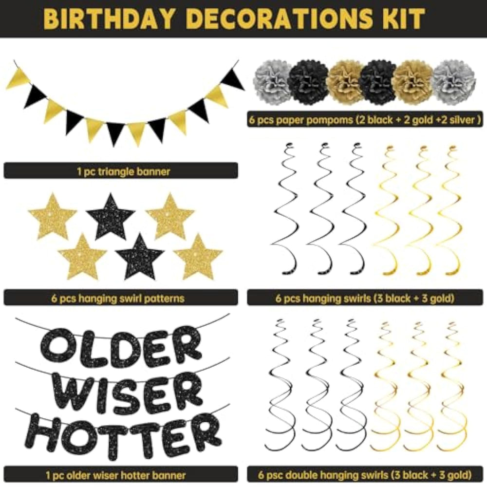 | ?You Will Get? 20Pcs Of Black Gold Happy Birthday Decorations Supplies, Including 1 Glitter "Older Wiser Hotter" Banner, 1 Triangle Flag Banner, 6 Double Swirls, 6 Hanging Swirls And 6 Paper Pompoms. | | ?Funny And Memorable? Elevate Your Birthday Party With Decorations That Blend Humor And Charm. Their Attention-Grabbing Aesthetics And Humorous Messaging Are Destined To Evoke Smiles And Hearty Laughs, Leaving Everyone With Cherished Memories. | | ?Well Made Material? Made Of Paper And Aluminum Foil, These Decorations Are Lightweight, Sturdy, Feature Clear Printing, And Are Reusable. | | ?Easy To Assemble?The Banners Come Equipped With Strings For Easy Hanging. Hanging Swirls And Tissue Pompoms All Have Pictures Or Videos With Instructions On The Product Page. Assembly Is Simple And Won'T Take Up Much Of Your Time When Decorating The Party. | | ?Widely Used?The Happy Birthday Banner Set Provides An Ideal Party Background. The Paper Pompoms Can Decorate Walls Or Tables, While The Hanging Swirls Create A Stunning Ceiling Display. Additionally, The Banners Can Be Easily Hung On Various Surfaces Such As The Front Door, Balcony, Walls, Windows, And Fences. | |