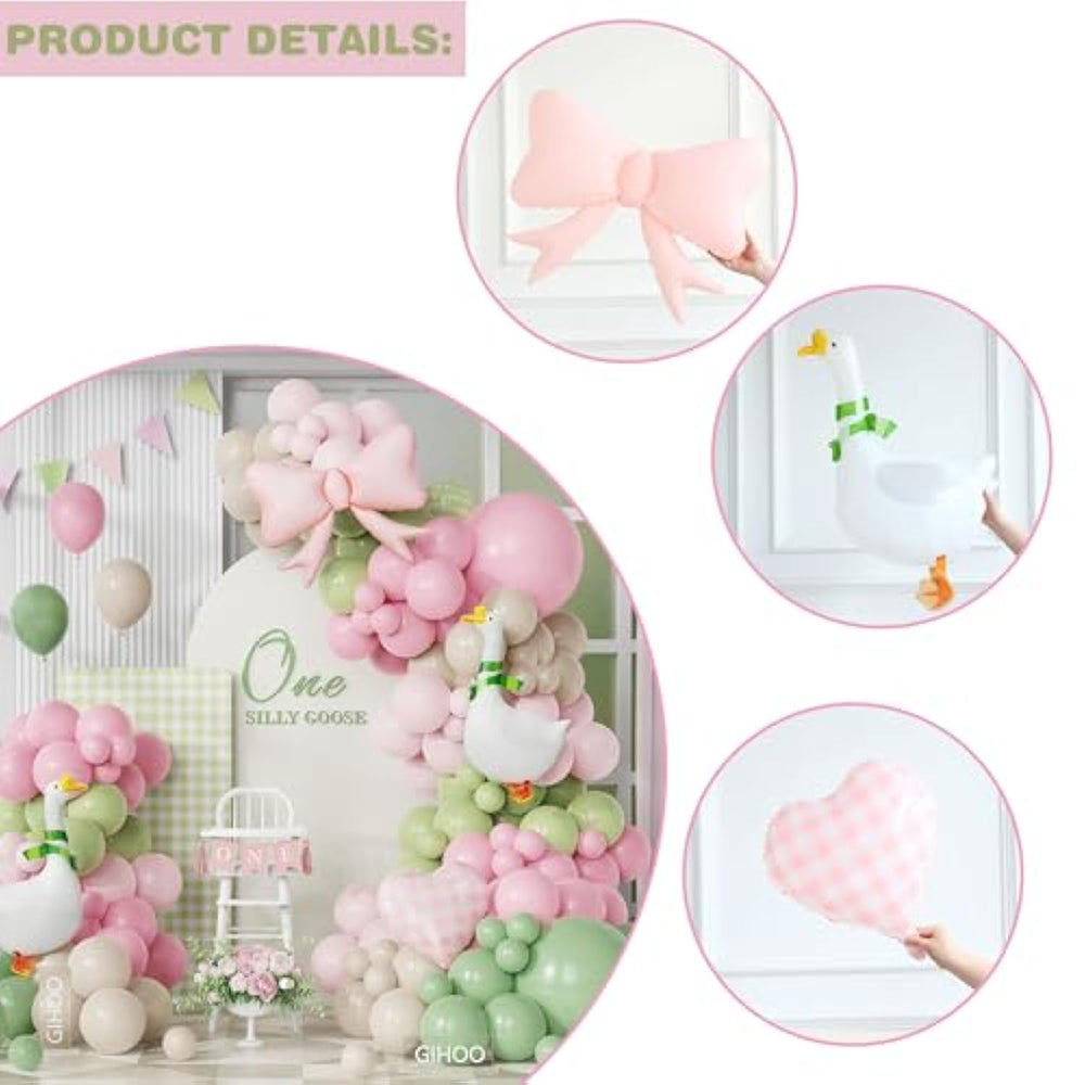 | Silly Goose Birthday Decorations:The Pink One Silly Goose Balloon Arch Kit Is A Great Decoration To Create A Lovely Atmosphere. Perfect For Creating A Stunning Silly Goose Birthday Party Decor In 30 Minutes. Use It To Brighten Up Your Silly Goose Themed Party And You'Ll Have An Unforgettable One Silly Goose Party Experience | | One Silly Goose Balloon Arch Kit: The Silly Goose Birthday Party Decorations Balloon Arch Kit Contains 137 Pieces Of Latex Balloons,2Pcs Walking Silly Goose Balloon,1Pc Pink Gingham Balloon ,1Pc Bow Balloon. The Fishing Balloon Arch Kit Also Contains One Balloon Arch And One Role Balloon Dot Glue(More Packing Details Show In The Package Picture) | | Multiple Use:The Silly Goose Themed Party Decorations Balloon Arch Kit Can Be Used For Silly Goose Birthday Decorations,Goose Birthday Decorations,Farm Birthday Decorations. Celebration Of Life For A Beloved Baby Party,And Other Silly Goose Themed Party. In Addition You Can Hang It On Dinner Tables, Door Frames And Trees Or Anywhere Else You Want And Bring Joy To Your Party. It Is Amazing How Simple Balloons Can Add So Much To Any Type Of Celebration.Create A Magical Birthday Party Your Child Will Never Forget | | Easy To Assemble:Just Enjoy The Diy Fun With The Finshing One Goose Silly Balloon Arch Kit.The Latex Was Pliable Enough That Youngsters Were Able To Tie Knots In The Balloons.Set Includes A Beautiful Pink Gingham Foil Balloon And A Matching Bow Balloon To Complement The Silly Goose Theme. Bright, Colorful, And Perfect For Creating A Festive Atmosphere That Wows Your Guests! | | Warm Tips:It Is Summer Now ,The Outdoor Temperature Is A Little High, It Will Easily To Popped And Burst On This Occasions And Please Inflate All Balloons 85% Full, Overfilled Balloons Will Be Popped. Any Questions ,Pls