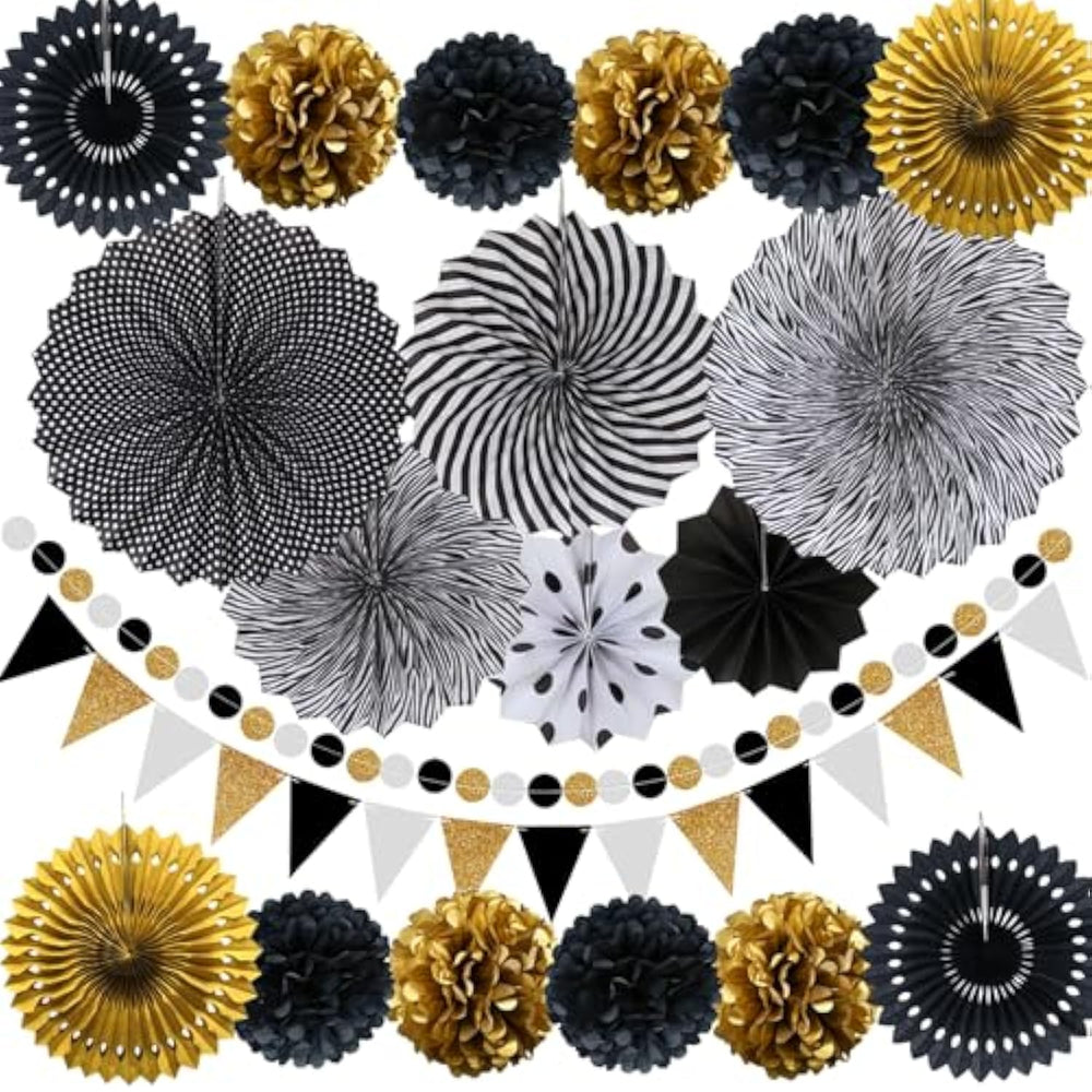 [Package Includes] 6 X Paper Fans + 4 X Hollowed Paper Fans + 8 X Paper Pom Poms + 1 X 2M/6.56Ft Circle Paper Garland + 1 X 2M/6.56Ft Triangular Pennants. | [Perfect For All Party Occasions] Our Black And Gold Party Decorations Sets Are Suitable For Birthday Party, Baby Shower Decorations, Garden Party Decorations, Celebration Decorations And Wedding. | [Quality Materials] The Navy Blue Party Decorations Are Made Of High Quality Eco-Friendly Paper And Plastic, Sturdy, And Can Be Reused As They Are Folded Up And Neatly Tucked Away. | [Easy To Use] The Items In The Package Are Pre-Folded To Save Your Time. The Paper Pom Poms Need To Be Assembled, Assembled Paper Pom-Poms, Paper Fan, Banners And Circle Paper Garland Can Be Hung Or Taped Together On Walls, Doors, Windows, Balconies Or Ceilings. | [Made Your Party Catch Every Eye] The Black And Gold Of Colorful Pom Poms, Paper Fans, Circle Paper Garland Make Your Party Memorable! Just Enjoy Happy Of The Colorful Party With Your Family Or Friend. |