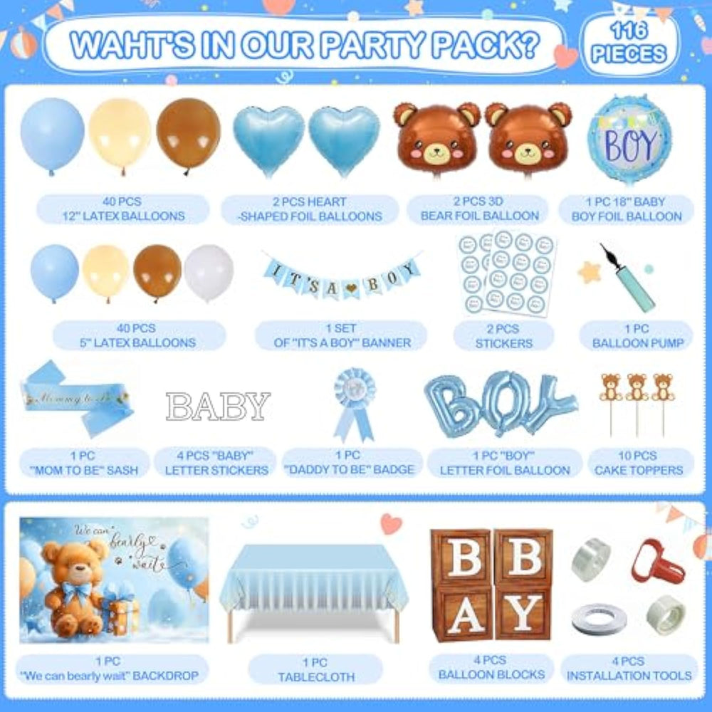 | ?Package Including?: 40X 12-Inch Balloons, 40X 5-Inch Balloons, 2 Heart-Shaped Aluminum Foil Balloons, 1 Round Foil Balloon, 2X 3D Sitting Bear Balloons, 1X "Boy" Foil Balloons, 1 Pc"Mom To Be" Sash,1 Set Of "It'S A Boy" Banner, 4 Balloon Boxes?2X 'Baby' Stickers, 1X Backdrop , 1X "Daddy To Be" Badge4X "Baby"" Stickers, 1X Tablecloth (54 Inchesx108 Inches), 10X Cake Toppers, 1X Balloon Pump, 4 X Accessories | | ?Captivating Package Design??As You Gently Lift The Lid Of Our Elegantly Designed Box, You'Ll Be Greeted By A Soft, Soothing Blue Background That Sets The Perfect Tone For Your Baby Shower Festivities. Nestled Within, You'Ll Find A Darling Bear Image, Its Playful Spirit Capturing The Essence Of Childhood Wonder And Innocence. But That'S Not All—Scattered Across The Box Are Blessing Words, Each One A Heartfelt Wish For The Precious Bundle Of Joy Soon To Arrive. | | ?Versatile Celebration Companion?: Party Spot'S Baby Shower Decoration Package Transcends The Ordinary, Perfect Not Only For Baby Showers But Also For Gender Reveal Parties, Sip-And-See Gatherings, First Birthday Extravaganzas, And More. Whatever The Occasion, Our Decorations Set The Stage For An Atmosphere Brimming With Festivity And Enduring Memories. | | ?Quality Assurance?:Crafted With Care, Party Spot'S Baby Boy Baby Shower Decorations Package Is Certified And Rigorously Safety-Tested, Ensuring It Remains Harmless For Expecting Mothers And Little Ones. Immerse Your Celebration In Elegance And Joy Without Compromising On Safety. | | ?Effortless Assembly?: We Understand The Importance Of Stress-Free Preparations. Our Baby Shower Decoration Package Comes With A Convenient Manual Pump To Make Inflating Balloons A Breeze. Follow Our Easy Instructions, Ensuring Latex Balloons Are Filled To 80-90% Of Their Maximum Capacity For Optimal Display. | | ?Dedicated To Your Satisfaction?: At Party Spot, We Are Committed To Delivering Excellence. Your Package Is Elegantly Packed In A Custom-Patterned Carton, And We Take Pride In Providing Top-Tier Products Free From Defects. In The Unlikely Event Of Receiving A Damaged Or Defective Item, Simply Reach Out To Us With Images Of The Issue, And We Will Promptly Arrange A Replacement Or Refund. | |