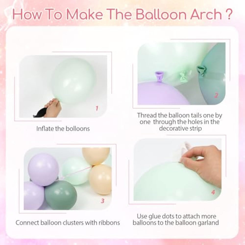 This pastel pink and purple balloon arch kit includes 157 pieces, featuring 36 purple balloons, 36 pink balloons, 31 teal balloons, and 31 pastel green balloons in various sizes, along with 10 nude balloons (10 inches) and 10 metallic gold balloons (5 inches). The set also includes essential accessories such as 100 glue dots, a pink ribbon, and a decorative strip for easy assembly. Made from high-quality latex, these balloons are durable, easy to inflate, and resistant to popping. A balloon pump is recommended for quick inflation while avoiding overinflation to maintain their shape. The included tools make it simple to create a stunning balloon arch—just inflate the balloons, form clusters, attach them to the decorative strip, and use glue dots to fill gaps. Perfect for baby showers, garden parties, tea parties, and spring-themed celebrations, this pastel balloon kit adds a charming and elegant touch to any event.
