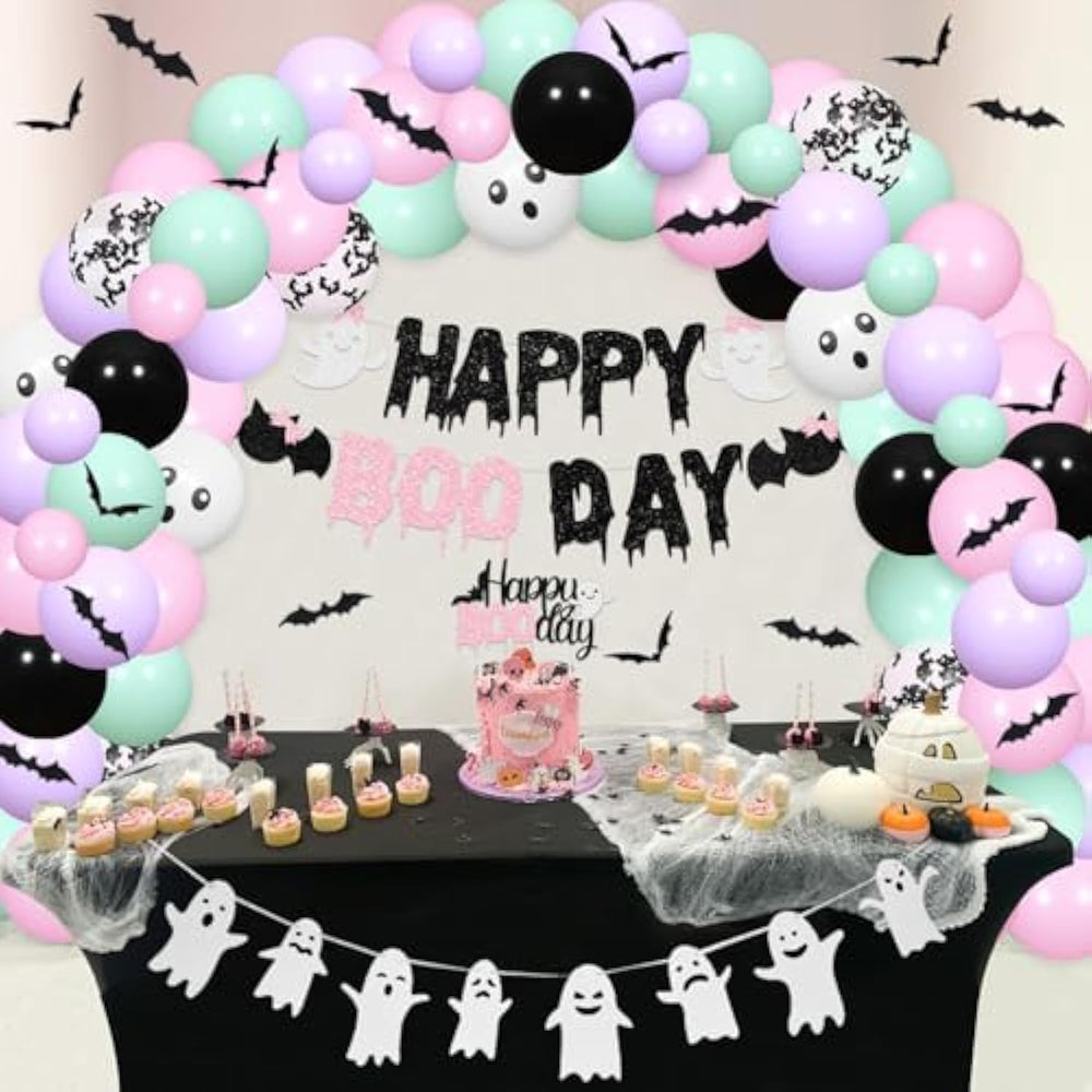 This Happy Boo Day Party Decoration Kit brings a charming, pastel-themed touch to any girl’s Halloween birthday celebration. The set includes 50 latex balloons (12”), 15 smaller balloons (5”), a “Happy Boo Day” banner, ghost garland, cake topper, 12 bat wall stickers, balloon tape strip, and a roll of adhesive dots, offering everything needed for a complete party setup. Crafted from glitter cardstock, the banner and cake topper are shiny, durable, and high quality. Ideal for girls’ Halloween birthdays, spooky parties, ghost parties, or baby showers, this kit adds a playful and festive atmosphere. Assembly is simple—insert the balloons into the tape holes and use the adhesive dots to fix the smaller balloons around the larger ones, creating a delightful pastel balloon garland.