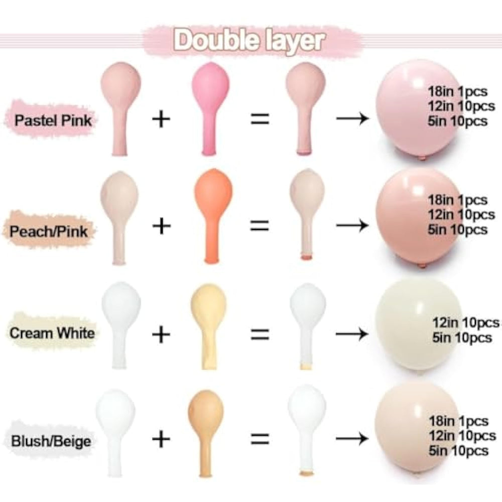 | Baby Pink Blush White Balloon Arch:Package Include Double Stuffed Blush/Cream Beige Balloons(5Inx10,12Inx10,18'Inx1),Double Stuffed Pink Peach/Blush Pink Balloons(5Inx10,12Inx10,18'Inx1),Double Stuffed Baby Pink/Pastel Pink Balloons(5Inx10,12Inx10,18'Inx1),Double Stuffed Pastel White/Matte White Balloons(5Inx10,12Inx10),A 16Ft Balloon Strip Tape,1Roll 100Pcs Glue Point.These Blush Balloon Garland Kit Can Be Make A Beautiful Statement Piece That Will Wow Your Guests | | Reliable Quality: Our Pastel Pink Beige Balloons Garland Are Made From Natural Rubber And Are Extremely Durable And Long Lasting. Double Stufffed Rose Pink White Balloon Arch Kit Can Be Filled With Air And Helium. The Air Filled Balloons Will Stay Up To 72 Hours And Helium Filled Balloons Will Stay Up To 4-6 Hours.Baby Pink White Sand Balloon Garland Are Non-Toxic And Do Not Explode Easily. Each Pink Peach Balloon Has Been Rigorously Tested And Screened To Be Safe For Use Around Children | | Easy To Assemble: Just Enjoy The Diy Fun With The Under The Rose Pink White Cream Balloon Arch Kit ., It’S Super Easy To Put Together. No Experience Necessary, Its Perfect For Any Occasion, And Pink Blush White Sand Balloon Arch Will Look Like A Pro Did It.We Recommend Using A Balloon Pump To Help Make Things Easier.And You Can Create Your Own Style By Searching On Youtube Tutorials | | The Fun Of Diy-Pink Blush Balloons To Meet Your Party Needs.Light Pink Cream Balloon Garland Arch Include Blush Balloons,Baby Pink Balloons,Sand White And Peach Balloons Match Together To Give The Balloon Garland A Saturated And Attention-Grabbing Look. Balloon Tape, Balloon Glue Points And Curling Ribbon Will Help You To Create A Gorgeous Wreath Arch Quickly. Enjoy The Fun Of Diy | | Wide Appliations -The Double Stuffed Matte Pastel Pink Cream Balloons And Blush Ivory Balloon Garland Suitable For Anniversary Party, Baby Shower, Wedding, Birthday,Bridal Shower;,Memorial Day,Bachelorette, Holiday,Bridal Shower Theme Party,Engagement. 2-3Pack Pastel Pink Blush Balloon Arch Kit Good To Create A Bigger Romantic ,Colorful And Gogeorous Party Scene | |