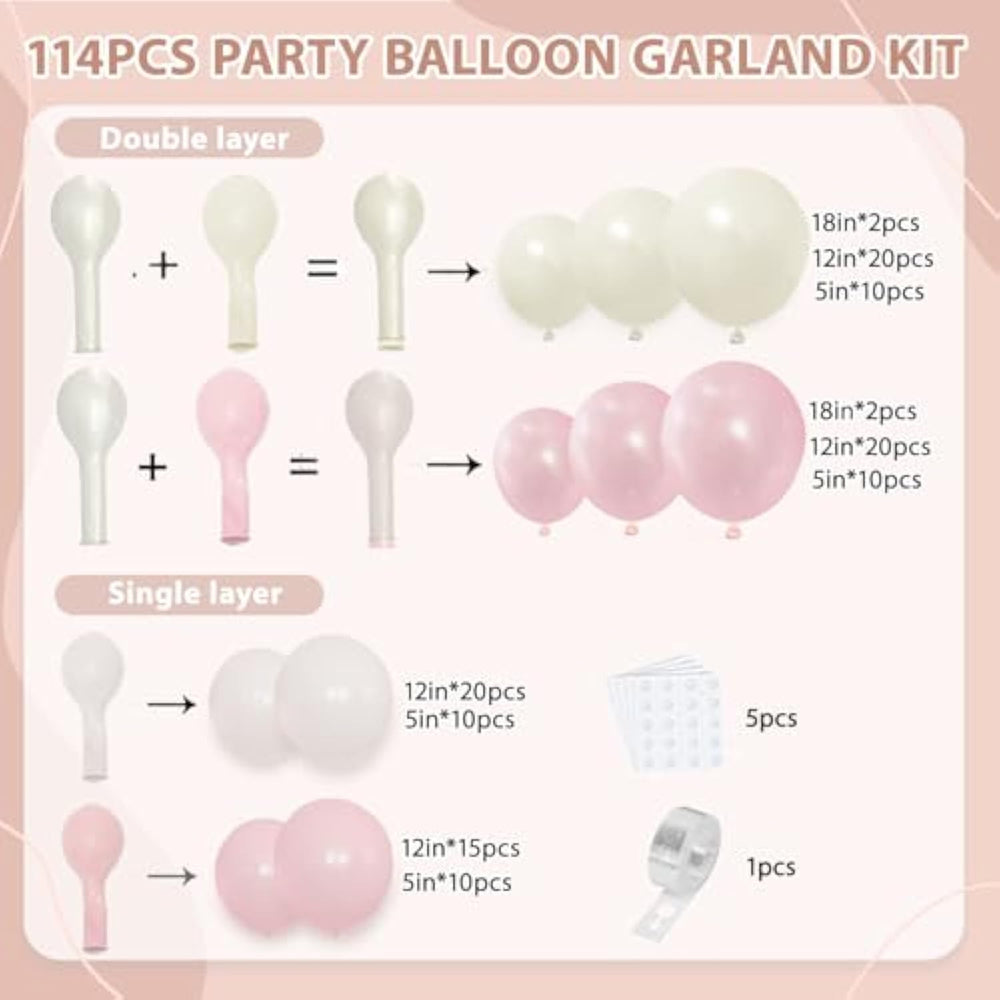 This pearl pink and white balloon garland kit includes 32 double-stuffed pearl pink and 32 pearl sand white balloons, plus 25 matte white and 25 light pink single-layer balloons, a decorative strip, and 5 balloon stickers. Made from high-quality, durable latex, these thick balloons resist popping and last for days, perfect for any celebration. Easy to assemble with included glue dots and strip: simply inflate, thread the balloons onto the strip, and fill gaps for a beautiful arch. Ideal for baby showers, weddings, birthdays, and more, this kit adds an elegant, festive touch to any event.