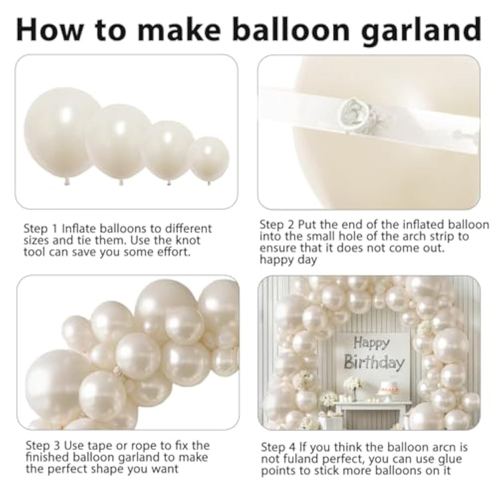 | Sand White Balloon Arch Kit: The Double Stuffed Pearl Sand White Balloon Garland Kit Includes: 85 Pcs Double Stuffed Pearl Cream White Balloons(5In-30Pcs 10In-30Pcs 12In-20Pcs 18In-5Pcs).1 Roll Of Balloon Strip Tape, 5Pcs Balloon Stickers. | | Excellent Quality Materials: This Double Stuffed Beige Sand White Balloon Decoration Is Made Of Sturdy Latex, Which Is Safe And Durable. It Is Thicker Than Other Balloons, Not Easy To Break And Last Longer. | | Easy To Assemble Diy : We Provide Balloon Chains And Adhesive To Make It Easier For You To Make A Pearl Sand White Beige Balloon Arch. You Can Add Balloons Of Other Colors To Diy A Beautiful And Warm Balloon Arch With Family And Friends, And Hang Them On Windows, Doorways, Dining Tables, Walls, And Anywhere You Like. | | Suitable Occasions: The Double Stuffed Pearl Sand White Balloon Garland Is Suitable For Various Festive Events. Such As Engagement Parties, Weddings, Baby Showers, Birthdays, Bachelorette Parties, Anniversary Parties, Princess Garden Parties, Etc. The Pearl Ivory White Balloon Garland Adds A Simple And Stylish Atmosphere To Your Party. | | Warm Tips: Do Not Inflate Double Stuffed Pearl Ivory Balloons To More Than 85%.Avoid Exposing The Pearl Sand White Balloon Garland Kit To Heat, Sharp Objects, Or Excessive Friction To Prevent Bursting. It Is Normal For Balloons To Oxidize After Being Inflated For A Period Of Time, So Don'T Worry. Beige Balloons Can Be Inflated With Helium And Air. | |