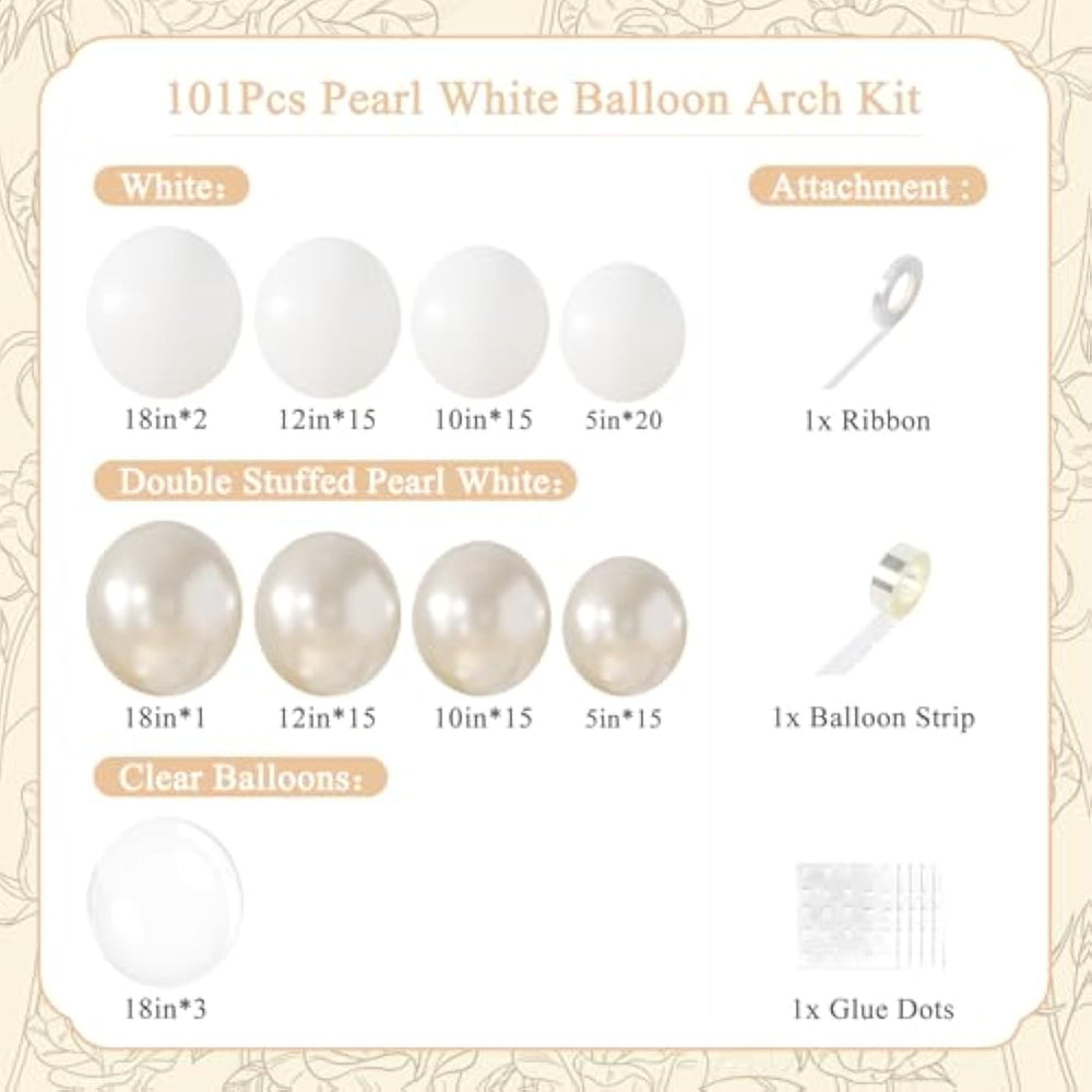 Create timeless, elegant decor effortlessly with this 101-piece Pearl White Balloon Arch Kit. Featuring a mix of double-stuffed pearl white, standard white, and clear balloons in assorted sizes, this kit includes everything you need—from glue dots to a balloon chain—for easy DIY setup. Crafted from 100% natural, non-toxic latex, the durable balloons resist popping and stay flawless throughout your event. Whether it’s for a wedding, bridal shower, baby shower, or birthday, this kit brings a sophisticated, professional look to any celebration with minimal effort.