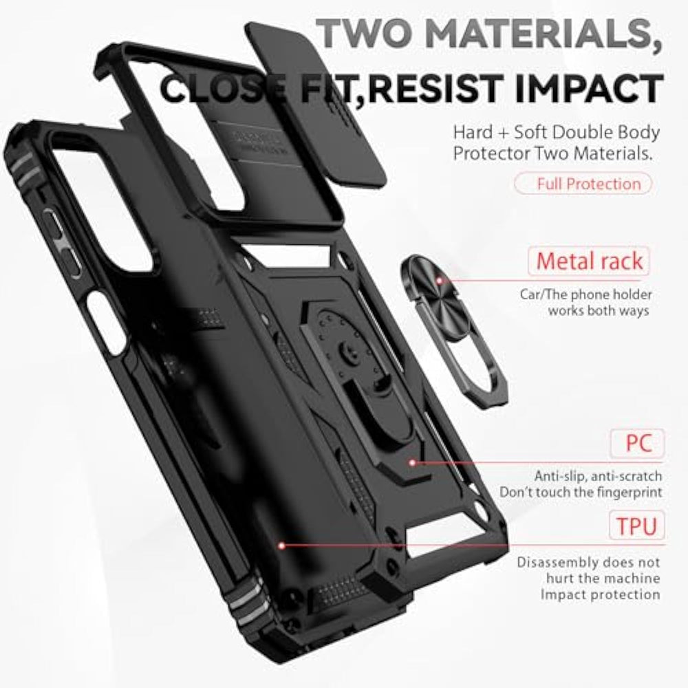 | ?Compatible With?Specially Designed For Samsung Galaxy A15 5G?2024?.Package Includes Soft Hd Screen Protector And Install Them According To The Instructions..?Note That?Wireless Charging Is Not Supported! | | ?Camera Lens Protection? This Phone Case Use Lens Slide Design, It Easy To Slide And Not To Loose, And Enhance Protective Of Your Phone Camera From Scratches, Collision, Scuffs And Impact, Not Only Improve Safety, Protect Your Privacy But Also Has A Sense Of Fashion. | | ?360° Rotable Magnetic Kickstand? Advanced Ring Metal Kickstand Can Rotate 360°, Easy To Rotate And Sturdy On The Phone Case. Built In Kickstand Gives You The Convenience To Watch Videos And Movies Hands-Free With Desired Comfort And Stability. | | ?Full Body Protection?The Phone Case Is Made Of Anti-Scratch Hard Rigid Pc Bumper And Shock Resistance Soft Tpu, With Air-Cushion Technology For All Corners And The Raised Tpu Bezel Design, Provide All Around Double Protection Of Your Phone From Drops, Scratches And Bumps. | | ?High Quality After Sales Service?We Are Committed To Producing High-Quality Products, If You Come Across Any Issues While Using The Product, Please Feel Free To Reach Out To Us.We Will Provide You With The Most Reasonable Solution. | |