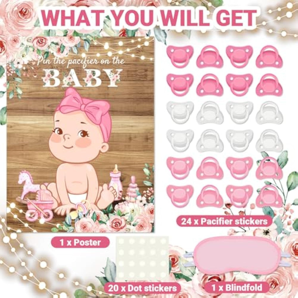| Delightful Baby Shower Games: 1 Large 21 X 28 Inch Rustic Baby Poster, 1 Pink Eye Mask, 24 Pacifier Stickers In 3 Colors And 1 Sheet Of Adhesive Dots (20 Pcs); This Pin The Pacifier On The Baby Game Set Comes In Plenty Of Quantity And The Floral Themed Poster Creates A Memorable And Warm Atmosphere | | Fun And Interaction: Stick The Baby Poster On The Wall And Everyone Can Write Their Name On The Pacifier Sticker; Blindfold The Players And Have Them Spin 3 Times; The Person Who Sticks The Sticker Closest Wins; These Pin On The Baby Games Can Be Applied As A Rustic Flower Baby Shower Party Decoration And Add Fun | | Elegant Floral Design: Our Pin The Pacifier Baby Shower Game Features A Rustic Floral Style, Decorated With Flowers, Wood Grain And Pastel Shades; The Eye Catching Design Adds A Touch Of Elegance And Sophistication To Your Party, Creating An Eye-Catching Visual For You And Your Guests | | Reliable Quality: The Main Material Of This Rustic Wood Baby Shower Decorations Is Quality Paper, Which Is Not Only Beautiful In Appearance, But Also Sturdy And Safe; The Poster Is Exquisite And Not Easy To Fade, Plus The Sweet Baby Pattern, It Will Be An Ideal Decoration For Your Baby Shower Party, Vintage Or Farmhouse Style Party | | Wide Range Of Uses: Our Pin The Pacifier Game Is Suitable For Rustic Floral Baby Shower Birthday Party, Baby Shower, Family Gatherings, Newborn Party, Vintage Party, Etc. They Can Also Be Applied As Photo Props, The Charming Design Makes Your Pleasant Moments More Warm And Creates Unforgettable Memories | |