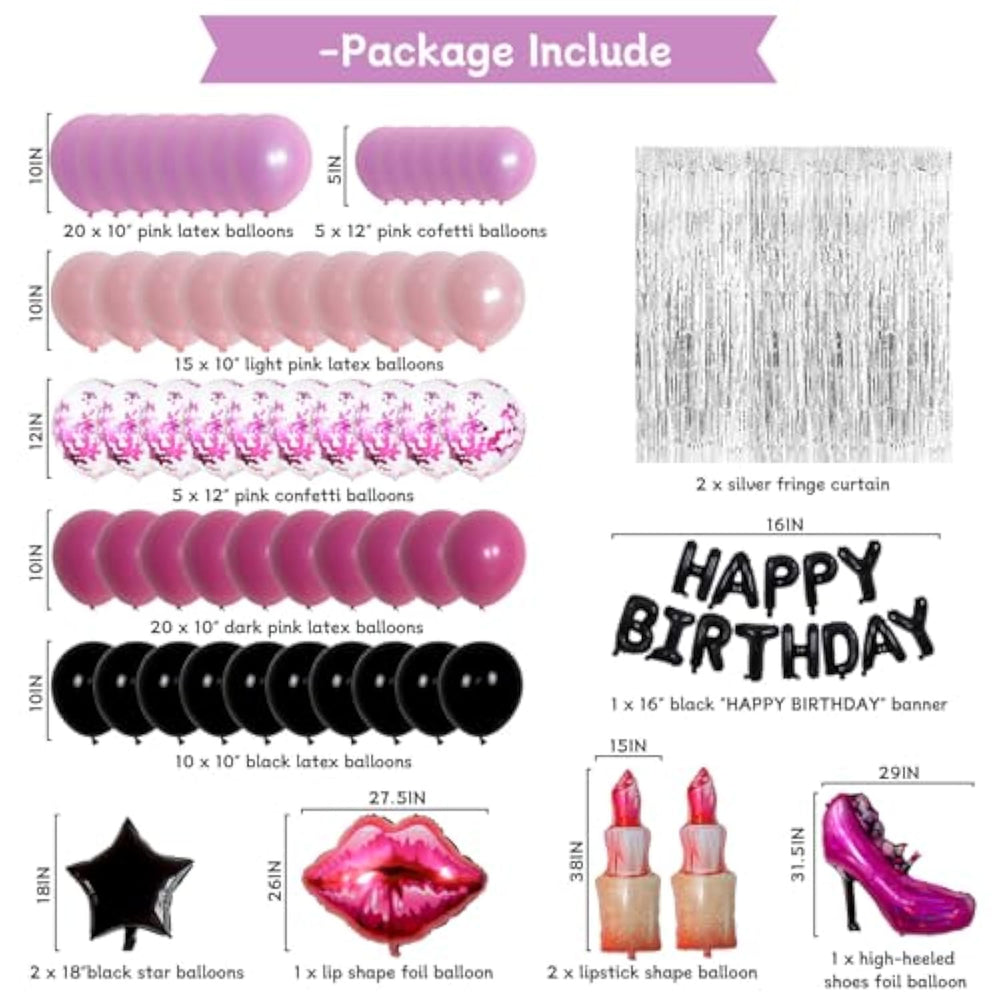 | Pink And Black Package Include: 20 X 10" Pink Latex Balloons, 20 X 10" Dark Pink Latex Balloons, 15 X 10" Light Pink Latex Balloons, 10 X 10" Black Latex Balloons, 5 X 12" Pink Confetti Balloons, 1 X 16" Black "Happy Birthday" Banner, 1 X High-Heeled Shoes Foil Balloon, 1 X Lip Shape Foil Balloon, 2 X Lipstick Shape Balloon, 2 X 18"Black Star Balloons, 2 X Silver Fringe Curtains, 1 X Dot Sticker, 1 X Ribbon, 1 X Balloon Strip. All This Black Pink And Silver Decor Set With Everything For Women Or Girls Who Love Pink Party Atmosphere | | Girls Party Birthday Decorations?The Pink And Black Birthday Decorations Set Used For Women, Girls, Girlfriend And Daughters Pink Themed Birthday, We Purpose To Provide The Satisfied Pink And Black Birthday Theme Decoration Kit. Have Fun Preparing The Surprise And Make Your Loved Ones Smile. | | Easy Install: The Silver Fringe Curtain Adds A Glamorous Backdrop And Instantly Transforms Any Space Into A Party Zone. This Cool Set Of Party Decorations. The Pink Black And Silver Colour Scheme Is Perfect And Has Everything You Needed. Whether You'Re Throwing A Party For A Little Girl Or A Grown Woman, This Kit Is Versatile And Suitable For All Ages. Beautiful Colors! Went Perfectly For 13Th,16Th, 18Th, 21St? 25Th, 30Th, 40Th, 50Th, 60Th, 70Th, 80Th Birthday Party! | | Multipurpose: Suit For Indoor Party, Outdoor Party. You Can Use This Banner As A Wall Decoration Or As A Masquerade Item. You Can Hang These Balloons Or Tape Them To The Wall. This Happy Birthday Decoration Is A Good Choice For Kids Girls Boys Adults' Birthday Decoration. You Can Able To Use It For A Combined Baby Shower/ Birthday Party/Girls Night Party/Wedding, Everyone Will Compliment The Amazing Party Surprise Decorate. | | Solve Your Doubts: If You Are Not Satisfied With Your Purchased For Any Reason, There Is No Problem, We Hope To Be Correct. We Are Committed To Providing You With The Most Creative And Unique Design To Provide You With The Best