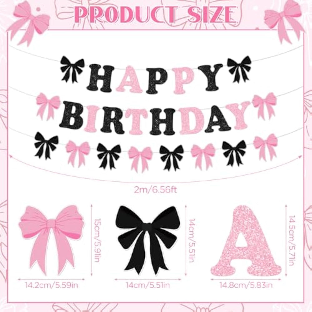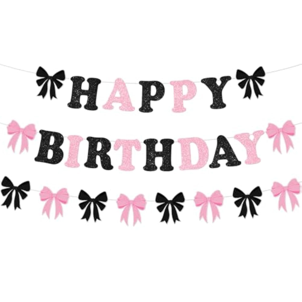 | Package Includes: You Will Get 3Pcs Black And Pink Bow Birthday Banners. This Bow Birthday Banner Is Great For Adding A Touch Of Celebration To Any Birthday Party Or Event, Making It The Best Choice For Creating A Cohesive And Stylish Party Atmosphere | | Bow Theme Design: The Unique Pink And Black Bow Design Adds A Touch Of Sophistication To Your Space. When Combined With The Happy Birthday Copy Design, This Pink And Black Bow Happy Birthday Decoration Set Will Add Charm And Attraction To Your Birthday Celebration Party And Be Very Appealing To Your Guests | | Quality Materials: Our Black Pink Bow Happy Birthday Banners Are Made Of High-Quality Glitter Paper, Thick Enough Not To Bend Easily, The Glitter On The Surface Adds Dazzle And Charm To Your Bow Themed Party | | Various Occasions: This Bow Birthday Decorations Set Is Versatile Enough To Suit A Range Of Party Celebrations, Whether It'S For A Bow Birthday Party, A Coquette Birthday, Black Pink Bow Party Decor, A Baby Shower, A Bridal Shower, A Wedding, Bachelorette Party. Just Hang It In The Place You Like And Easy To Hang And Decorate Your Room, Wall, Kitchen, Doorway, Office, Garden, Etc | |