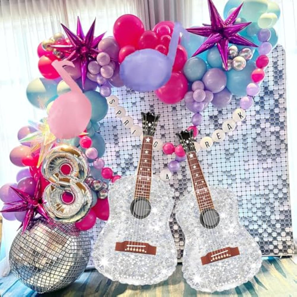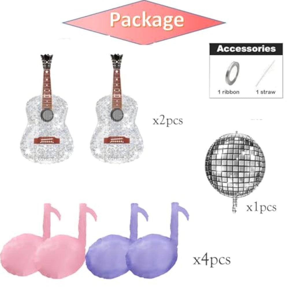 | 1: Package: Each Package Comes With 2Pcs Guitar Foil Balloons, 2Pcs Pink Music Note Balloons, 2Pcs Purple Music Note Balloons, 1Pcs Disco Ball Balloon,One 10M Ribbion And One 20Cm White Plastic Straw,The Straw Can Be Used To Inflate The Balloons With Your Mouth And Also Deflate The Balloons. | | 2:Balloon Inflation:These Balloons All Support Helium!!! | | 3:Party Decoration: Use Our Pink And Purple Music Note Balloons To Decorate Your Kids Birthday Party Decoration, Shiny Guitar Balloon Disco Balloon Can Bring A Deeply Impression For Your Party . | | 4:These Balloons Are Made Of Decent Nylon And Printings, Can Be Reused Without Any Problem.So After Your Party,If You Want To Use Next Time Or Gift Your Friends,Just Deflate And Pack Them Well. | | 5: