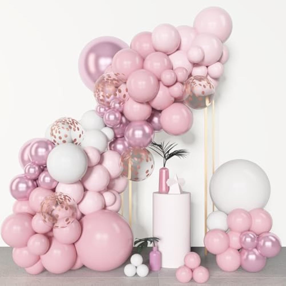 This pink and white balloon arch kit includes 153 balloons in a mix of sizes (18", 12", 10", 5") and finishes—metallic, pastel, and confetti—along with essential tools like balloon strips, flower clips, hooks, ribbon, glue dots, and a tying tool for easy setup. Made from high-quality latex, the balloons are durable, flexible, and safe for children. Perfect for baby showers, birthdays, weddings, or Valentine's Day, this kit adds a charming touch to any event. With simple assembly tools included, creating stunning garlands or daisy balloon clusters is quick and fun.