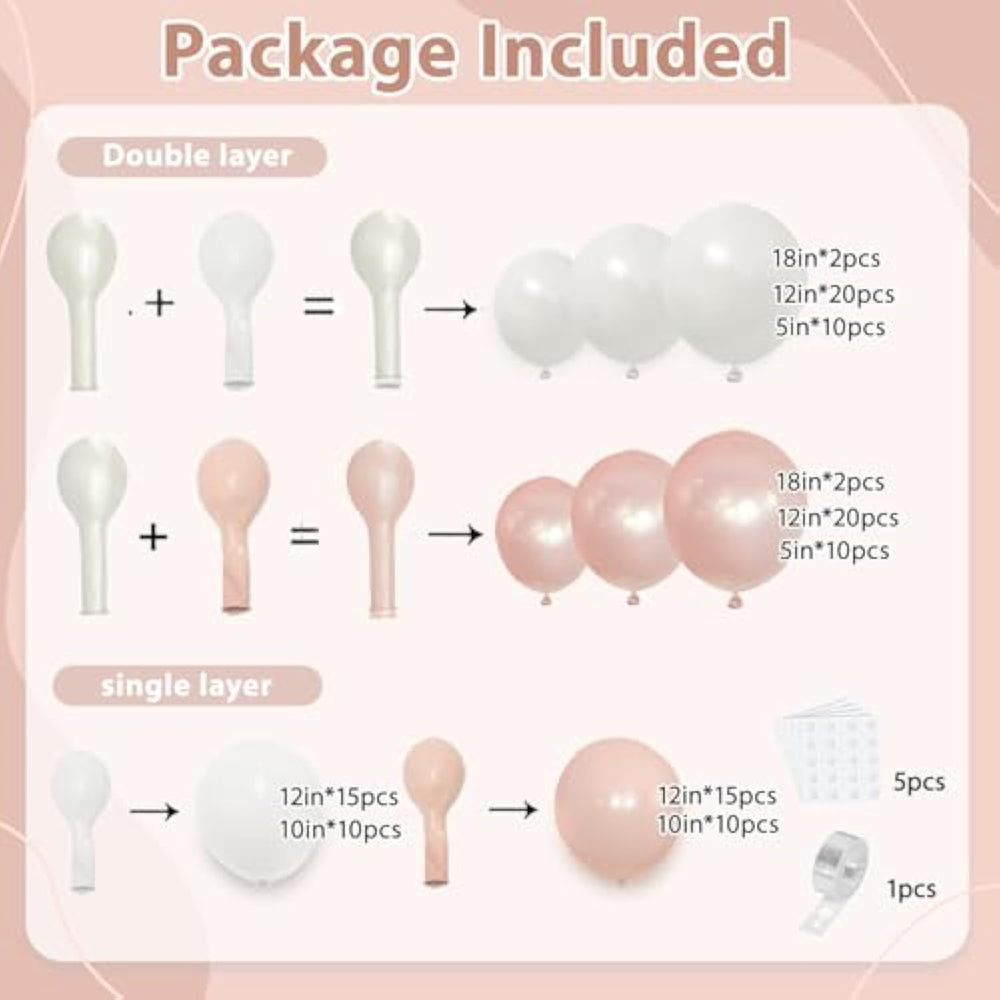 Pink And White Balloon Arch Kit: Different Sizes Of Light Pink And White Balloons Arch Kit Double Stuffed Are Made Of High Standard Quality, Thick Material. We Also Provide Balloon Arch Strips And Balloon Sticky Dots To Create A Pastel Pink Balloons Arch Kit | Light Pink Balloons Arch Kit: The Baby Pink Balloons Arch Kit Double Stuffed Includes 119 Balloon Set, Pearl White Balloons (18''-2Pcs; 12''-20Pcs, 5''-10Pcs), Pearl Maca Orange Balloon (18''-2Pcs; 12''-20Pcs, 5''-10Pcs), Matte White Balloons (12''-15Pcs; 5''-10Pcs), Maca Orange Balloons(12''-20Pcs; 5''-10Pcs) And 1 Roll Of Chain + 5 Pieces Of Adhesive | Easy To Assemble: This Set Of Baby Pink Balloons Can Be Inflated With A Special Helium Tool And Comes With The Accessories Needed To Assemble The Garland, Which Can Effectively Make Your Party Decoration Easy And Fun | Multiple Color Applications: These Mini Pink And White Balloons Arch Kit Can Be Used For Pink Bow Party Decorations, Pastel Pink Birthday Decorations, Weddings, Bridal Showers, Baby Showers, Birthday Parties, Anniversaries, Valentine'S Day Decorations, Bachelorette Parties, New Year, Christmas, Indoor Or Outdoor Events, Girls, Women, Kids, Etc. | Warm Tips: Please Avoid Exposing The 5 Balloon Packs To Direct Sunlight Before Use, Which Will Damage The Quality And Consumption Of The Balloons; Production Process: To Inflate The Pink And White Latex Balloons Into A Round Shape To Prevent The Balloons From Bursting; Danger Danger: Adult Supervision Is Required; Keep Uninflated Balloons Out Of Reach Of Children |