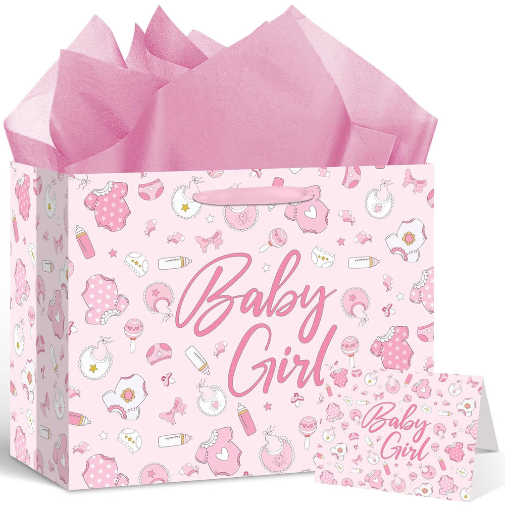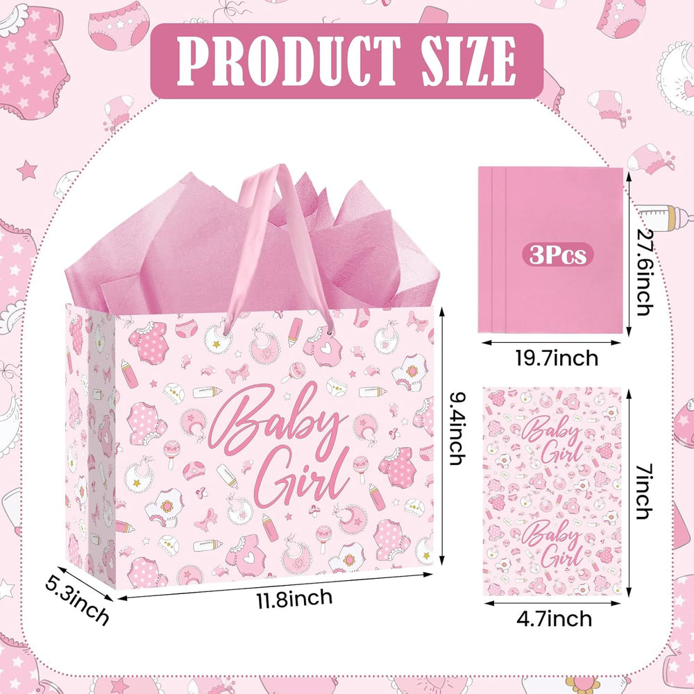 | What’S Included: You’Ll Get A Complete Gifting Solution For A Newborn Baby Girl. This Pink-Themed Baby Girl Gift Bag Set Contains 1 Lovely Girl Gift Bag With Handles, 1 Nicely Designed Greeting Card, And 3 Tissue Paper Sheets For Elegant Stuffing. Practical Size: With Dimensions 30×24×13.5 Cm (11.8×9.4×5.3 Inches), This Pink Welcome Baby Wrap Bag Has Ample Space For Popular Baby Shower Gifts. It Fits Essentials Like Baby Clothes Sets, Bath Products, A Photo Frame, Small Meal Kit, Or Smaller Gift Collections, Keeping Them Organized Neatly. Quality Material: Made Of Thick Paper, This Baby Girl Shower Gift Bag Helps Hold Presents Steadily While Maintaining A Neat Look. The Greeting Card Uses Premium Stock For A Luxurious Feel, And The Tissue Paper Is Soft Yet Substantial Enough To Shield Items And Add To The Delightful Unboxing Experience. Lovely Design: Our Cute Baby Shower Wrapping Paper Bag Has An Adorable Design, Printed With Charming Baby Items Like A Baby Romper, Feeding Bottle, Little Socks, And Baby Bib. This Lovely Pattern, In Soft Warm Hues, Captures New Life’S Joy And Innocence—Suitable For Celebrating A Darling Little Princess’S Arrival. Versatile Occasions: This Pink Baby Girl Wrap Bag Set Works For More Than Baby Showers—It’S Well-Suited For Newborn Welcome Parties, First Birthdays, Christenings, Or Organizing Baby Essentials For Family Outings. It’S A Fit For Gifting To Newborn Baby Girls, Making Presentations Practical And Memorable As A Heartfelt Thoughtful Gift.