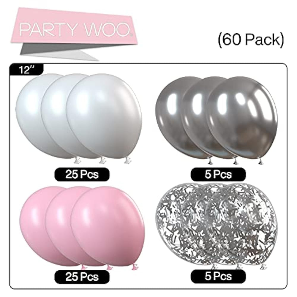 60 Pcs Pink Balloons Set: 12 Inch Pearl White Balloons (25 Pcs), 12 Inch Light Pink Balloons (25 Pcs), 12 Inch Silver Metallic Balloons (5 Pcs) And 12 Inch Silver Confetti Balloons (5 Pcs), Ideal Pink And White Balloons, Pink Party Decorations | Non-Toxic Safe: Astm (American Society For Testing Materials) Certificated Balloons, Made Of Natural Latex. These Party Balloons, Silver Confetti Balloons, Silver Balloons, Birthday Balloons, Confetti Balloons, Metallic Balloons Are Ideal Balloons Garland Kit For Birthday Party | What To Fill With: These Balloons Can Be Filled With Air And Helium. Latex Balloons Filled With Air Will Stay Full For Up To 72 Hours, While With Helium Will Stay Full For 3-6 Hours. These Birthday Balloons, Helium Balloons For Parties, Are Ideal Balloons For Birthday Party, Glitter Balloons For Parties | Applications: These Light Pink Balloons, Pink And White Balloons, Pink And Silver Balloons, Pastel Pink Balloons, Balloons Pink, Metallic Balloons Are Perfect For Birthday Party Decorations, Pink Party Decorations, Birthday Party Supplies | Attention Warning: Certain Color Difference Occurs After Inflation, But The Color Effect Will Be Better. Please Do Not Overfill The Balloons. Due To Automatic Packing System, Please Kindly Note That Any Holes Or Popped Balloons Within 1-3 Pcs For Every 100 Balloons Is A Normal Phenomenon |