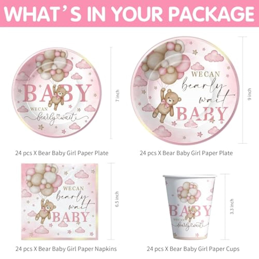 | ?Bear Baby Girl Party Decorations?Make Your Baby Shower Extra Special With This Charming Pink Bear Design! Pink Bear-Themed Baby Shower Table Decorations Party Tableware Celebrate A Baby Girl’S Arrival With Cute And Stylish Decorations | | ?Complete Party Solution?This Pink Teddy Bear Baby Shower Party Decorations Can Accommodate Up To 24 Guests And Includes Everything You Need: 24Pcs 9'' Bear Baby Shower Dinner Plates, 24Pcs 7'' Dessert Plates, 24Pcs Napkins, 24Pcs Cups, 24 Sets Of Disposable Cutlery, 24Pcs Paper Straws, 8Pcs/Set Pink Bear Party Swirls, 1Set Bear Baby Shower Banner, 1Pcs Bear Baby Shower Tablecloth. Get These Bear Baby Shower Table Decorations To Elevate Your Celebration | | ?Premium Quality Materials?Made From Quality Materials, This Bear Decorations For Baby Shower Tableware Is Both Stylish And Reliable. Sturdy Plates And Cups Handle Meals With Ease, While The Napkins And Tablecloth Add A Touch Of Elegance To Your Celebration ?Premium Quality Materials?Made From Quality Materials, This Bear Decorations For Baby Shower Tableware Is Both Stylish And Reliable. Sturdy Plates And Cups Handle Meals With Ease, While The Napkins And Tablecloth Add A Touch Of Elegance To Your Celebration | | ?Versatile Usage?Whether It'S A Gender Reveal, Baby Shower, Baby Sprinkle, Or Girl'S First Birthday, This Pink Bear Baby Girl Party Supplies And Decorations Set Adds A Sweet And Festive Touch To Any Event | | ?Easy To Cleanup?Host A Party With Disposable Baby Girl Decorations Tableware. After The Fun, Just Toss Them Out For An Easy Cleanup. Enjoy More Time Celebrating And Less Time Cleaning | |