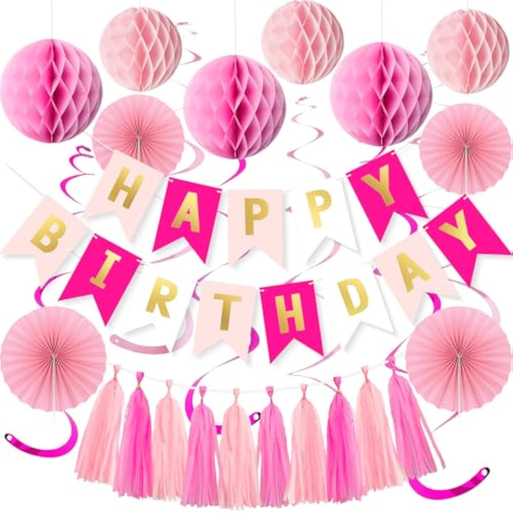 | ?Easy Assembly ?: Pink Women Girl Birthday Decorations, Happy Birthday Banner With Honeycomb Balls, Hanging Swirl Streamers Tassel ,Pink Paper Fans Birthday Decorations Paper Comes With Ribbon Dot Point Glue Two Paper Clips And Is Ready Can Be Reused Easy To Use For Future Parties.The Kit Includes Enough Decorations Is Sure Creating That Is Both Chic With Our Pink Happy Birthday Decorations, You'Ll Have Everything You Need To Create The Perfect Party Atmosphere. | | ?What You Will Get?:You Can Get 1Pcs Happy Birthday Banner, 6Pcs Honeycomb Balls, 6Pcs Hanging Swirls Streamers, And 4Pcs Pink Paper Fans. No Need To Worry About Running Around And Finding Individual Items. With Our Pink Birthda Party Decoration Package, You'Ll Have Everything You Need To Create The Perfect Party Atmosphere.And Can Be Reused Many Times. Save Your Money And Time. | | ?Fantasy Party?: This Happy Birthday Banner Set Is Such A Fun And Festive Way To Decorate For Birthday Party.Featuring A Wide Range Of Bright And Bold Pink, Our Decorations Will Create A Lively And Party Festive Versatile For Every Age Atmosphere That Your Kids And Their Friends Will Love. | | ?Perfect For All Ages?: Ideal For All Ages Girls Women Birthday Party Affordable Pink Birthday Decor Add A Touch Of Whimsy To Your Birthday Party, With Elegant Pink Birthday Centerpieces Fun Pink Birthday Banner S, You Can Create A Magical Atmosphere That Your Child And Their Friends Will Remember For Years To Come. | | ?After-Sales Service?:We Are Very Confident In The Quality Of These Women Girls Set.If You Have Any Quality Problems,We Are Always At Your Service Until You Are Satisfied. | |