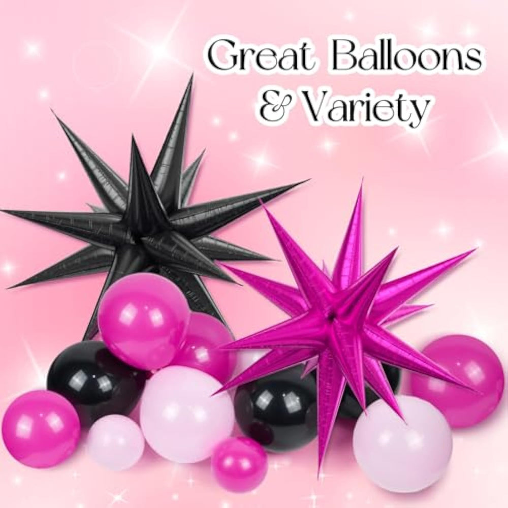 The pink and black balloon arch kit includes 41 hot pink balloons in various sizes, 36 black balloons, 31 light pink balloons, a black foil balloon, a hot pink foil balloon, 10 metallic pink balloons, 60 glue dots, a pink ribbon, and a decorative strip. Made from high-quality latex, these balloons are durable and easy to inflate. For quick setup, use the included ribbon, glue dots, and decorative strip to assemble a beautiful balloon arch. Perfect for birthdays, baby showers, bridal showers, weddings, and other celebrations, this kit adds a vibrant touch to any event.