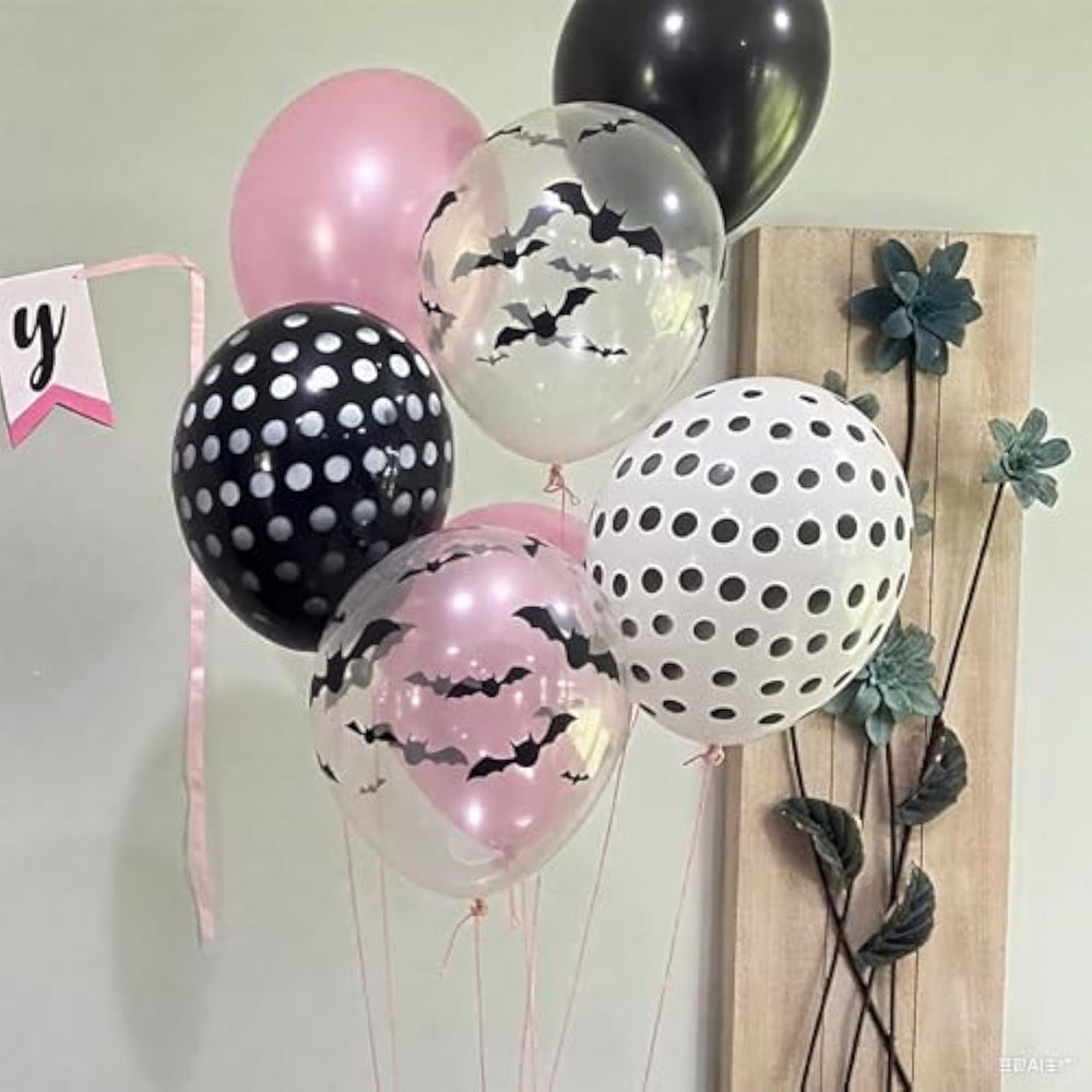 This Halloween balloon set includes 50 twelve-inch balloons: 10 pearl pink, 10 black polka dot, 10 white polka dot, 10 bat-printed, and 10 solid black balloons, plus a set of black bat stickers and a roll of ribbon. Made from high-quality latex and Mylar foil, the balloons are thick, durable, non-toxic, and eco-friendly, ensuring safe use for adults and kids. Perfect for Halloween parties, birthdays, baby showers, or spooky-themed decorations, they can be used indoors or outdoors on walls, windows, doors, porches, or as part of photo backdrops. Easy to inflate with air or helium, these balloons add a fun, festive, and spooky atmosphere to your celebrations.