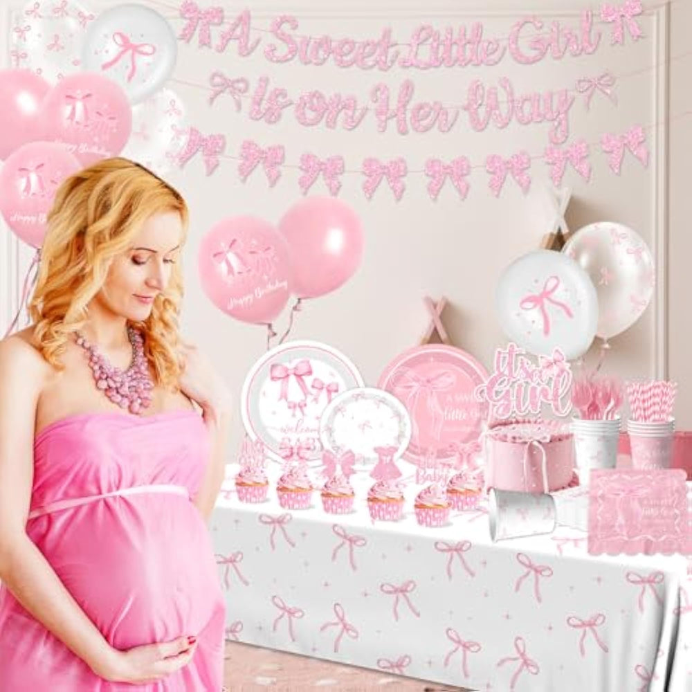| A Sweet Little Girl Is On Her Way?Includes 2Pcs Pink Bow Tablecloths (86.6X51.1Inch), 26Pcs Dinner Plates (9Inch), 26Pcs Dessert Plates (7Inch), 1Pcs Banners (5.51X7.08Inch), 25Pcs Napkins (6.5X6.5Inch), 25Pcs Forks, 25Pcs Straws, 26Pcs Cups (9Oz), 12Pcs Bow Balloons, 1Pcs Cake Toppers, 20Pcs Cupcake Toppers, Serving 25 Guests And Meeting Your Party Needs! | | Material?This Pink Bow Baby Shower Tableware Is Made Of High-Quality Paper With Clear Printing That Is Not Easily Faded. The Napkins Are Soft, Absorbent, And Tear Resistant, While The Plates And Cups Are Sturdy Enough For You To Use With Confidence. | | Pink Bow Theme Design?The Pink Bow Design Brings Elegance And Romance To Your Party Or Daily Gathering! Our Baby Shower Party Tableware Features Pink And White Bow Decorations, ''A Sweet Little Girl Is On Her Way'' And ''Welcome Baby'', Warm And Dreamy. | | Enjoy The Party?A Sweet Little Girl Is On Her Way Reduces Cleaning Time With Tableware, After The Party, You Can Collect And Throw Them Away, Which Is Convenient And Quick. It Is Perfect For Indoor Or Outdoor Use, And You Can Enjoy The Happy Time Of The Party With Your Family And Friends. | | Occasion?Pink Bow Baby Shower Party Tableware Are Suitable For Welcome Baby Decorations, A Sweet Little Girl Is On Her Way Themed Decorations, Bow Birthday Parties, Bridal Showers, Baby Showers, And Girl Baby Shower Decorations, Creating Unique Memories For Your Party. | |