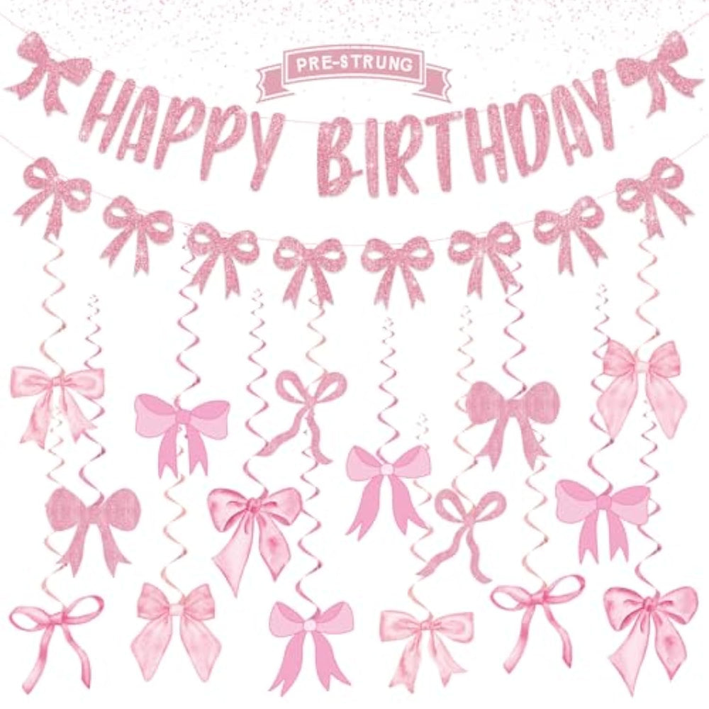 | Adorable Pink Party Decorations: The Bow-Themed Party Decorations Includes Happy Birthday Banner, Bow Garland, And Spiral Hanging Decor With Bow Accents, All Perfectly Coordinated And Rich In Detai, Adding A Touch Of Style And Romance To Your Celebration. | | Pre-Assembled And Easy To Decorate: The Bow Party Banner Comes Pre-Assembled, So You Just Need To Take It Out And Hang It On The Wall, Dessert Table, Fireplace, Room, Window, Or Anywhere You Want To Add Charm, Saving Your Valuable Time. | | Unique Design: Hanging Swirls Decorations Feature Trendy Shades Of Pink And Rose Gold With Bow Patterns, Combined With Double-Sided Printing, Adding Festive And Joyful Vibe To Your Party, Creating A Warm And Cheerful Atmosphere For Your Birthday Party. | | Perfectly Coordinated Party Supplies: The Happy Birthday Banner Is Crafted From High-Quality Glitter Paper That Adding A Brilliant Sparkle. It Pairs Seamlessly With Pink Party Decorations Like Bow Balloons, Bringing An Elegant Touch To Your Celebration. | | Versatile Decorations: The Pink Party Decor Is Perfect For Various Events Like Baby Showers, Or Princess-Themed Party. They Can Also Be Used As Photo Props, Creating Beautiful Backdrops To Capture Precious Memories With Family, Kids, And Friends. | |