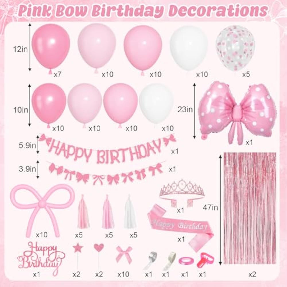| Pink Bow Birthday Decorations: Coquette Birthday Decorations Include 92Pcs Balloons, 1Pc Pink Bow Garland, 1Pcs Happy Birthday Banner, 10Pcs Pink Bow Decor, 15Pcs Paper Tassels, 1Pc Bow Foil Balloon,4Pcs Tools, 5Pcs Cake Toppers, 1Pcs Shoulder, 1Pc Crown And 2Pcs Fringe Curtains | | Premium Quality: The Bow Themed Party Decorations Are Made Of Natural Latex And Thick Paper Material Which Is Safe For Children And Adults To Use, Resist Bending And Fading, Ensuring Your Bow Birthday Decorations Can Last For A Long Time Throughout Party | | Elegant Pink Bow Design: The Bow Balloons Kit Are Designed In An Elegant Pink Bow Style, With Various Shapes Of Pink Bows, With Its Stylish Design, It Will Bring A Touch Of Sleek And Sweetness To Your Party And Make Your Party Eye-Catching | | Multiple Occasions: The Bow Themed Party Decorations Are Great For Pink Birthday Decorations, Bow Party Decorations, Girls Party Decorations, Or Other Pink Themed Events And These Special Decorations Will Hold An Impressive Gathering For Your Guests | | Easy To Assemble: The Bow Decorations For Party Include 4Pcs Balloon Tools (Arch Strip, Ribbon ,Tying Tool,Glue Points) To Help Make A Beautiful And Charming Pink Balloon Garland Easily; And Long Balloons Can Create Bow Balloons That Can Add More Romantic Atmosphere | |