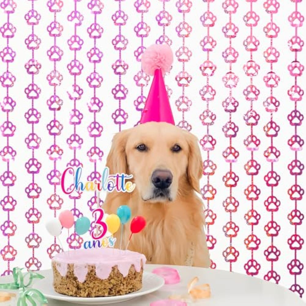 This set includes 2 large pink dog paw tinsel foil fringe curtains, each measuring 3.3 x 6.6 ft—perfect for puppy-themed birthday parties. Made from high-quality, durable tinsel, these curtains are lightweight, tear-resistant, and reusable. Easy to hang with included double-sided adhesive, they’re great for decorating doorways, windows, walls, dessert tables, or photo booth backdrops. Ideal for pet parties, these shimmering curtains add a playful and festive vibe to your dog’s special celebration.