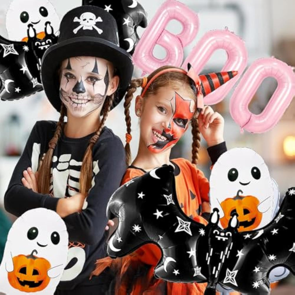This Halloween Birthday Party Balloon Set includes 9 foil balloons: 3 pink 16-inch “BOO” letter balloons, 3 ghost balloons measuring 10.6 × 17.7 inches, and 3 bat balloons measuring 17.7 × 37 inches, along with a roll of ribbon and an 8 cm straw for easy inflation. Made from high-quality, durable, and eco-friendly foil, these balloons are lightweight, self-sealing, and reusable, maintaining their vibrant colors without cracking or fading. Featuring cute pink bat and ghost designs, they serve as fun photo backdrops or party props, adding a whimsical and festive touch to any Halloween celebration. Simple to inflate with a straw or air pump, the balloons seal automatically for hassle-free setup, making them an ideal choice for Halloween decorations.