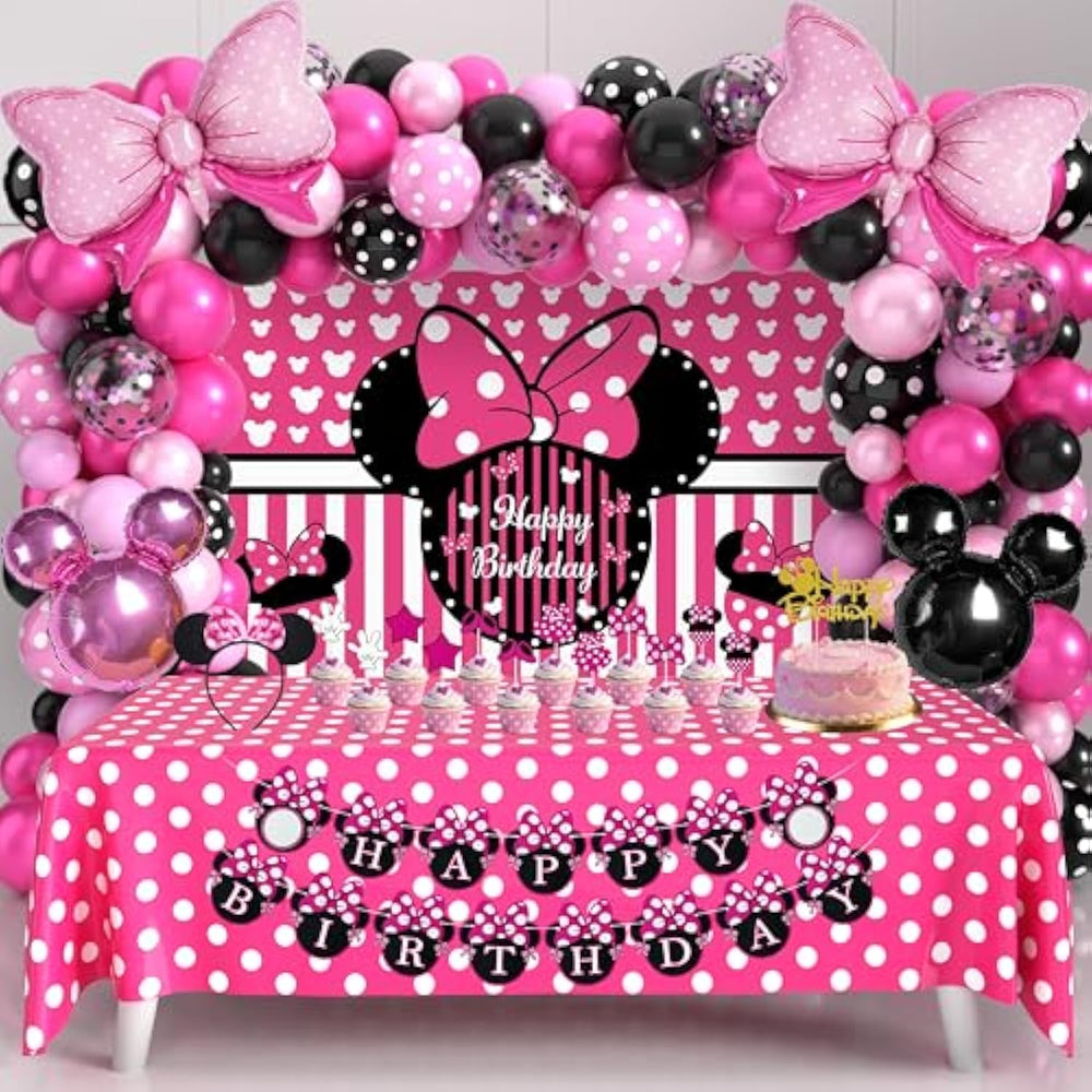 | Complete Party Set -- All-In-One Kit? Includes: 1 Backdrop, 1 Tablecloth , 1 Headband, 12 Cupcake Toppers, 1 Glitter Large Cake Topper, 1 "Happy Birthday" Banner, 2 Pink Bow Foil Balloons, 2Pcs 24In Mouse-Head Balloons (Black And Rose Red), 85 Latex Balloons, A Set Balloons Tools. | | High-Quality Materials---The Balloons Included In The Party Are Made Of High Quality Latex, Heavier And More Elastic Than Normal Balloons, Brightly Colored And Not Easy To Fade. The Tablecloth Is Made Of Plastic, Waterproof And Oil-Proof, Convenient To Apply. | | Chic Mouse Theme Design -- The 12”Black And Pink Polka Dot Balloons Fit Perfectly With The Rose Polka Dot Tablecloth. The Cute Foil Balloons And Backdrops Made The Whole Party Pop And Are Sure To Make Unforgettable Memories. | | Quick Easy Setup -- The Kit Includes Balloon Tools To Help You Quickly Complete A Balloon Arch! The Backdrop Has Hooks On All Four Corners, Easy To Hang, Comes With Rope, No Need To Buy Separately. You Can Also Diy With Your Family And Friends To Enjoy The Fun Of The Party! | | Perfect For Multiple Celebrations -- Ideal For 1St-5Th Birthdays, Girls Mouse Themed Birthday Party, Baby Showers, Princess Parties, Or Gender-Neutral Celebrations. Complete Cute Mouse Party Decorations For You To Create The Perfect Party Vibe. | |