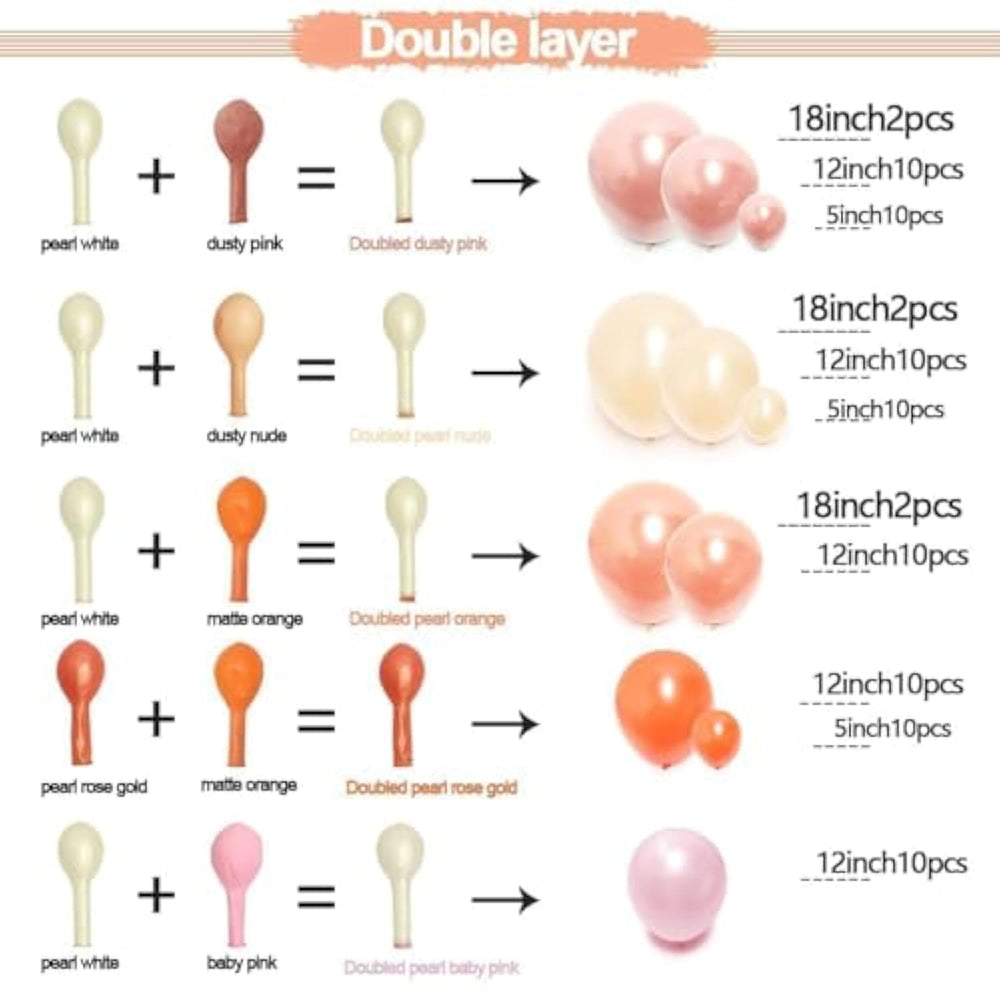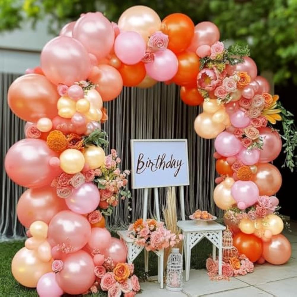 Create a stunning and colorful party setup with this double-stuffed orange and pink balloon arch kit! The kit includes 22 pcs 18/12/5 in pearl dusty pink balloons, 12 pcs 18/12 in pearl orange balloons, 20 pcs 12/5 in pearl rose gold balloons, 10 pcs 12 in pearl baby pink balloons, and 22 pcs 18/12/5 in pearl nude balloons, along with a balloon garland strip, glue dots, and white curling ribbon. The combination of soft pinks, warm oranges, rose gold, and nude shades in varying sizes delivers a rich, visually striking display perfect for birthdays, baby showers, or fall celebrations. Made from high-quality latex, the double-stuffed balloons are durable, thick, and resistant to bursting, safe for kids and adults, and last at least 72 hours with proper inflation. Easy to assemble, you can mix and match colors and sizes on the included strip, attach with glue dots, and decorate walls, doors, or even use as a curtain—making DIY balloon garlands fun, creative, and stress-free.