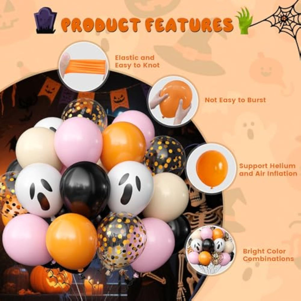 This pink and orange Halloween balloon set includes 60pcs 12-inch balloons—15 macaron pink, 15 black, 15 orange, 6 apricot, 5 white ghost-printed, 4 Halloween confetti balloons, plus 2 rolls of ribbon—creating a colorful and festive setup for your party. Made of high-quality latex, these balloons are durable, non-toxic, and safe for kids, suitable for air or helium filling. The confetti balloons add extra sparkle—simply rub or add a little water inside to help the confetti stick. Perfect for Halloween birthday parties, Trick or Treat events, spooky gatherings, or even themed baby showers, these balloons make a unique backdrop and photo prop, adding charm and fun to any indoor or outdoor celebration.