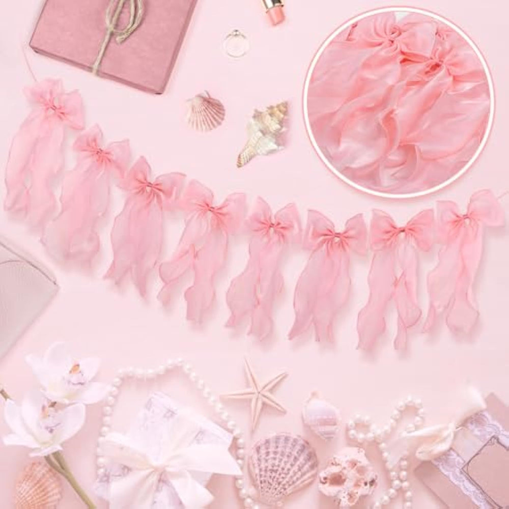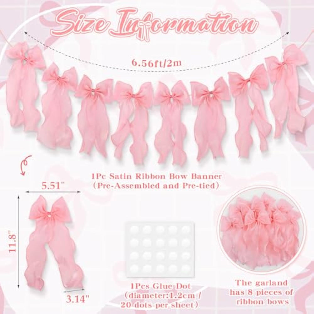 | What You Will Get: 1 Pc Bow Garland + 1 Pc Glue Dot, Each Bow Banner Is About 6.56Ft/2M Long And Has 8 Pieces Of Ribbon Bows ; The Bow Is About 11.8 X 5.5 X 3.1 Inches; Easy Decorations To Any Places And Scene | | Pre-Strung Ready To Hang: This Ribbon Bow Party Garland Comes With Pre-Strung, Ready To Hang, Just Spread It Out And Hang It On The Place You Prefer, Ideal For Indoor Or Outdoor Decorations | | Premium Quality: Crafted From High-Quality Soft Ribbon Material, Smooth, Comfortable And Reusable, Handmade Bows Are In A Good Shape, Nice For Decorations, Fetured With Pretty Colors And Exquisite Craftsmanship | | Versatile Decorations: Perfect Addition To Your Holiday Party(Christmas, Easter, Halloween, Etc.), Girls Bow Birthday Party, Pink Bow Party Decor, Baby Shower, Tying The Knot Bridal Shower, Wedding, Bachelorette Party, Girls'S Night, To Add To Your Space If You Think It Needs Just A Few More Bows | | Pink Ribbon Bow Garland: Add A Touch Of Charm And Elegance To Your Space With Our Handmade Bow Garlands! Simple And Versatile, Also Can Be Used As Room Decor Multiple Places As Decorations To Add To The Festive Atmosphere, These Garlands Are The Perfect Decorative Accent | |