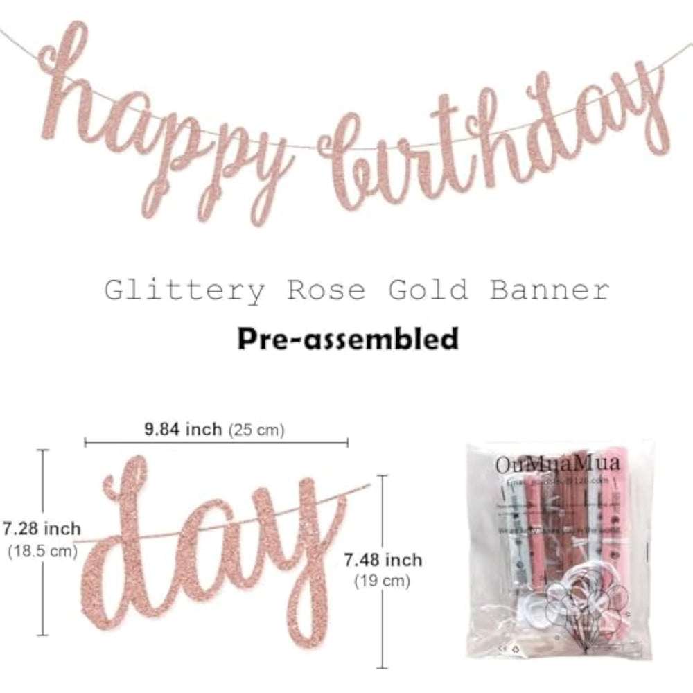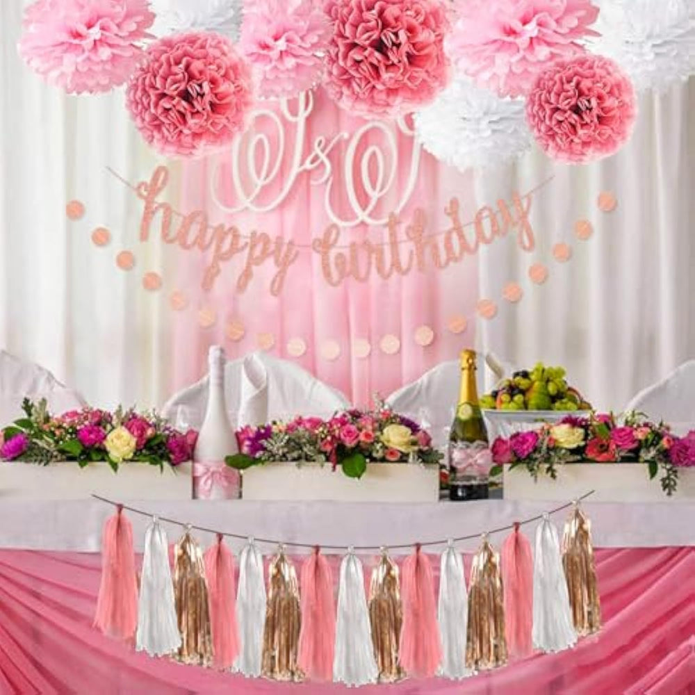Elevate your celebration with this luxurious 4-in-1 Rose Gold Birthday Party Decoration Kit. The set includes a glittery "Happy Birthday" banner, tissue paper pompoms, a circle dots paper garland, and a tassel garland—all crafted from premium materials for a stunning, elegant look. Perfect for milestone birthdays like 18th, 21st, 30th, and beyond, it’s also ideal for bridal showers, baby showers, bachelorette parties, and gender reveals. Easy to use, the banner and garlands come pre-assembled—just unpack and hang—while clear instructions make assembling the pompoms hassle-free. Add a glamorous finishing touch that’s sure to impress your guests and make your party unforgettable!
