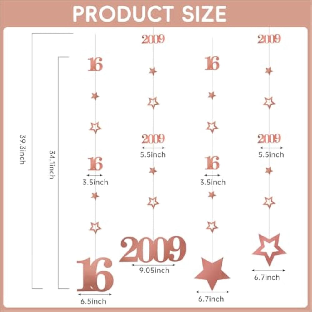 | [You Will Get] -8Pcs Pre-Stung Rose Gold 16Th Metal Birthday Decorations For Girls, Each Individually Packaged, Single Back Length Is 39.3 Inches, Creating A Sweet 16Th Birthday Party For Your Girls. | | [Back In 2009 Design] - The Rose Gold Glitter Numbers "2009" And "16" Highlight The Birthday Theme, Create A Sweet And Romantic Atmosphere, And Attract Attention, Becoming The Fashion Center For The Sixteen Birthday Celebrations. | | [Applicability] - Suitable For The 16Th Birthday Theme Girl'S Party. The Beautiful Combination Of Numbers And Stars Is Easily Adaptable To Indoor Banquet Halls And Outdoor Garden Parties, Adding Endless Charm To A 16Th Birthday Party. | | [Easy To Assemble] - Pre-Strung, Easy To Hang, And Can Be Hung At Doorways, Walls, Windows, Fences, Branches, Corridors, And Your Favorite Places. You Can Create A Perfect Golden Sparkling Theme For Your Birthday Party In Just A Few Minutes. | | [Good Materials] - Made Of High-Quality Plastic Materials, It Will Not Rust Or Lose Its Luster For Long-Term Maintenance Of Bright Luster. | |