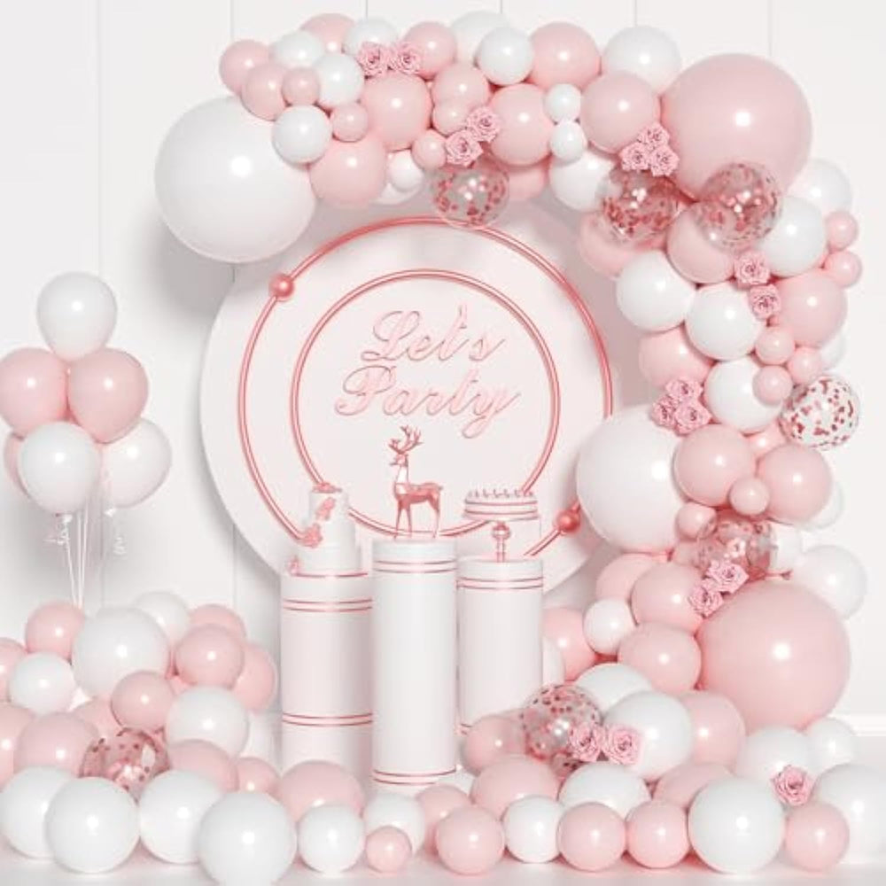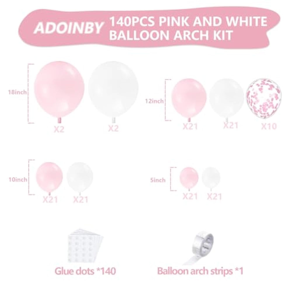 Add a soft, elegant touch to your celebration with this Pink and White Balloon Garland Arch Kit. The 140-piece set includes a variety of pink, white, and pink confetti balloons in 5", 10", 12", and 18" sizes, plus a 16ft garland strip and 140 glue dots for easy setup. Made from high-quality, non-toxic latex, the balloons can be filled with air or helium. Assembly is simple with included tools—just pull balloon knots through the strip and secure with glue dots. Perfect for weddings, birthdays, baby showers, gender reveals, and more.