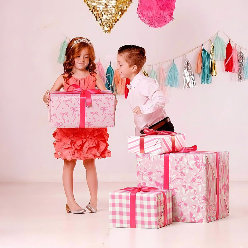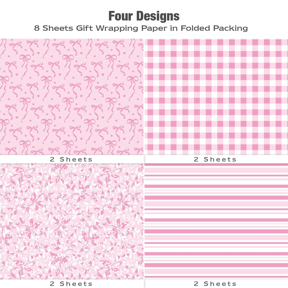 | Great Value Pink Wrapping Paper: Include 8 Sheets (4 Designs, 2 Sheets Of Each Design), Each Paper 20×28 Inches, One Set Will Wrap Several Small And Medium Gifts, Quickly And Easily. Eye-Catching Designs: The Pink Birthday Wrapping Paper Sheets Feature 4 Designs: Pink Cute Ribbon Bow, Plaid, Stripes And Leaves. These Pink And Cheery Gift Wrap Will Add A Cute Touch Of Elegance And Sweetness, Making It An Excellent Choice