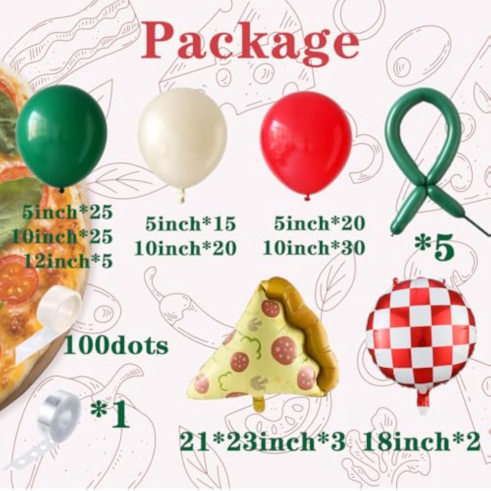 The Pizza Party Decoration Kit includes 145 latex balloons in 5", 10", and 12" sizes (red, green, ivory white, and long green), 3 pizza-shaped balloons, and 2 red-and-white checkered balloons, along with a 16.4 ft balloon tape and a roll of dot glue for easy assembly. Perfect for pizza-themed birthday parties, BBQs, picnic parties, baby showers, summer gatherings, or restaurant and home decor, this kit lets you create a fun and festive atmosphere. Made from high-quality latex, each balloon is durable, safe, and crafted with attention to detail. Simply string the balloons together on the tape, secure with the glue dots, and design a vibrant, eye-catching balloon arch that will delight guests of all ages.