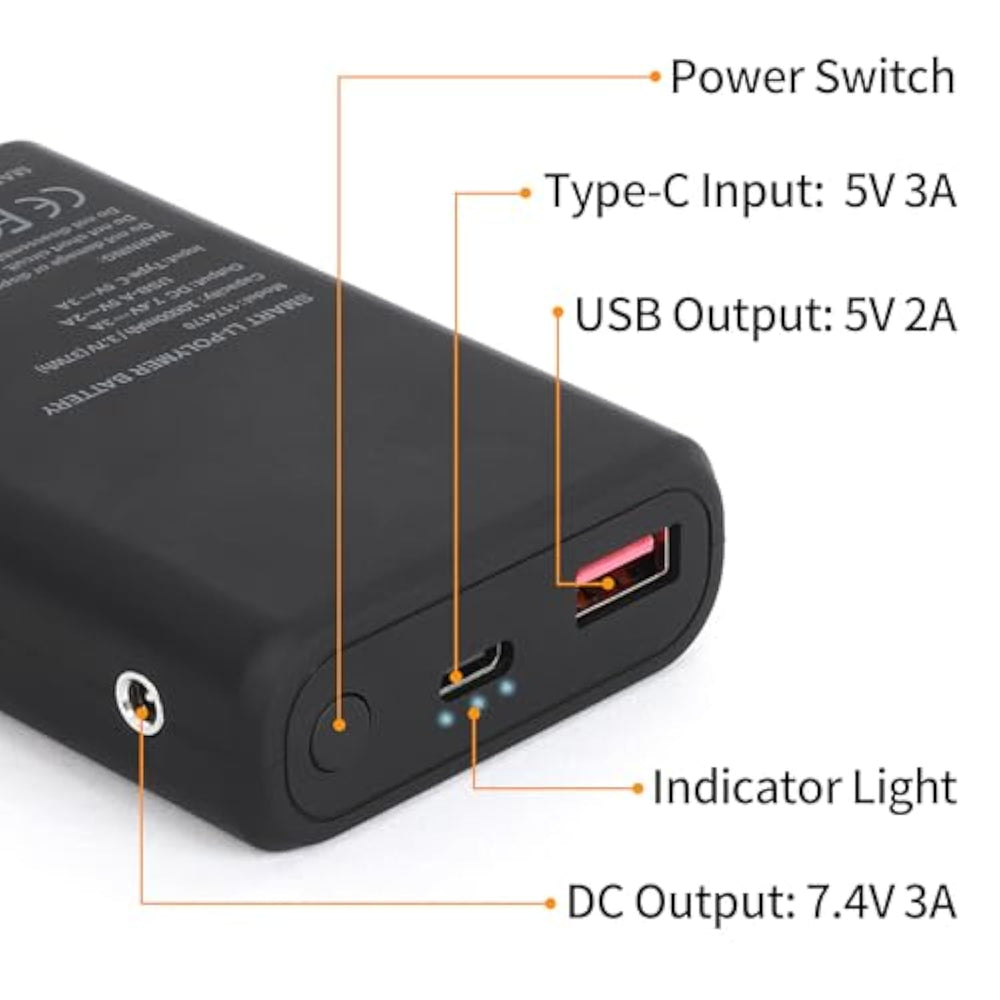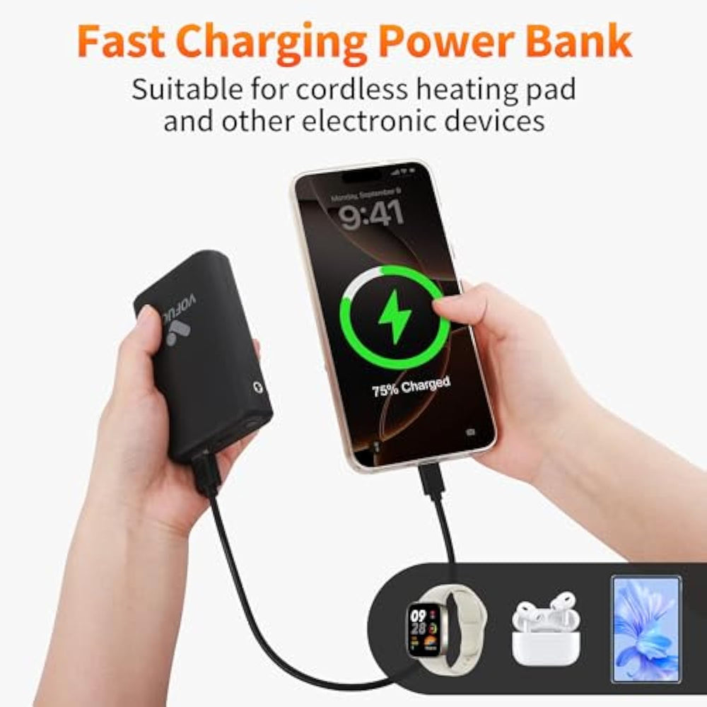 | 1*Power Bank And 1*Usb Type C Charger Cable Included | | Power Bank Fully Charge Time:Use 5V 2A Charger: About 7 Hours; Use Fast Charger: About 5 Hours. (You Can Order A 5V 3A Fast Charger In Our Store If Necessary, :B0Ctk3Yvcz) | | This Power Bank Is Suitable For Cordless Portable Heating Pads And Can Also Charge Other Electronic Devices With Usb C Ports | | When The Battery Is Charging, The 3 Indicators On The Battery Will Flash. When The Battery Is Fully Charged, The 3 Indicators On The Battery Are Blue | | The Power Bank Is Small Size And Lightweight, The Size Is 3.6” * 2.3”* 0.8” And The Weight Are 0.39 Lbs | | Output: Dc 7.4V 3A, Usb-A 5V 2A; Input:Type C 5V 3A; Capacity:10000Mah 37Wh; Ul Ce Pse Certified | |