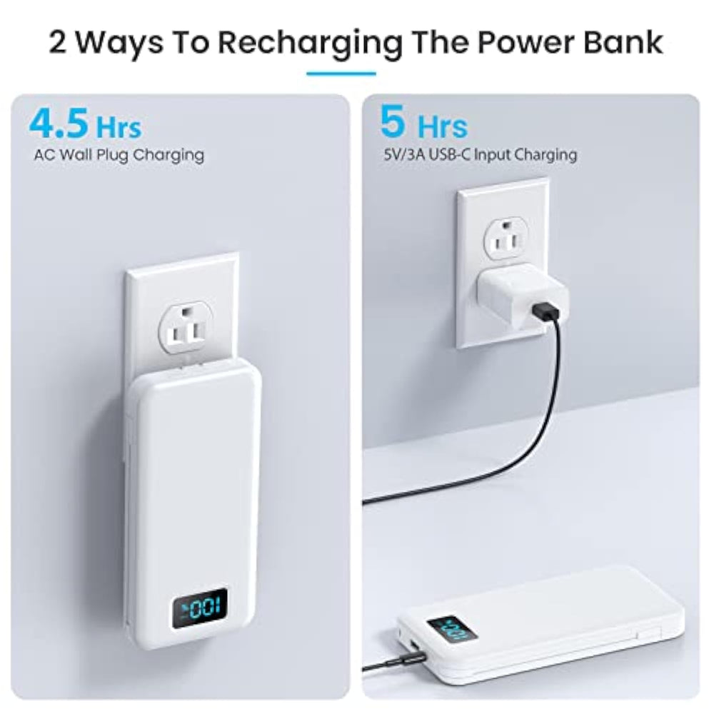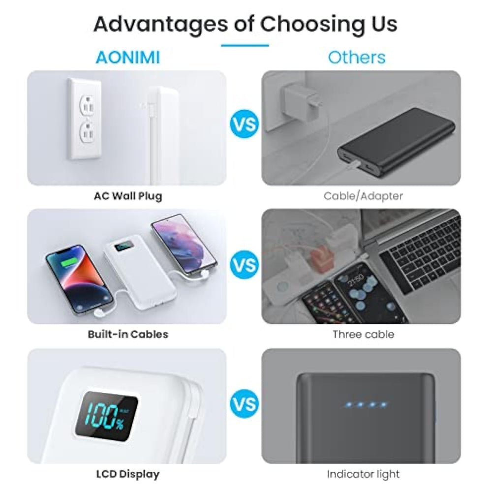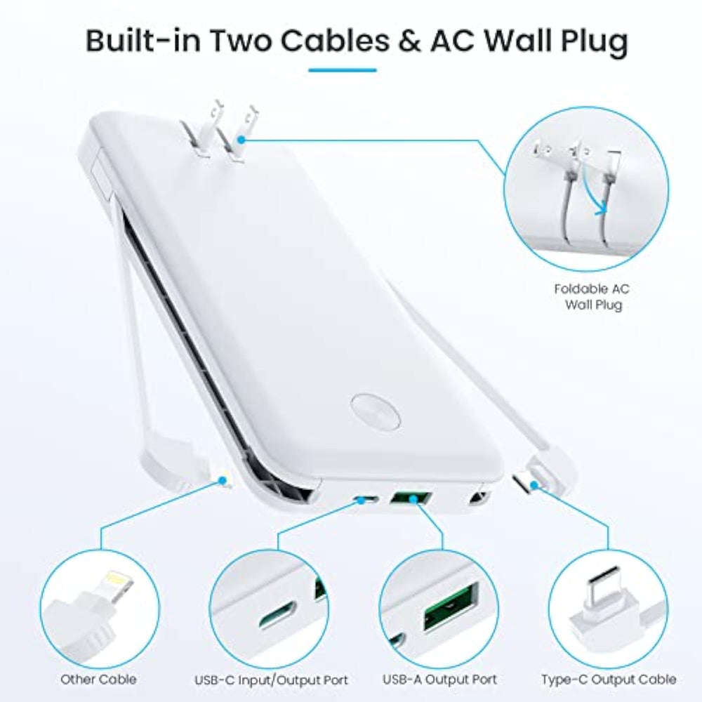 | ?Portable Charger With Built In Cables And Ac Wall Plug?This 13800Mah Portable Phone Charger Not Only Built-In 2 Types Cables ( Usb C And Other Type Cables),But Also Is Equipped With Usb-C Input/Output And Usb-A Output .The Built-In Ac Wall Plug Allows You To Recharge Itself Directly From The Wall Outlet, No Need To Carry Your Cable And Adapter Everywhere Any More. | | ?4 Output Portable Charger For Multiple Devices ?4 In 1 Output Portable Charger,This Battery Backup Is Designed With 4 Outputs (2 Outputs Charging Cables, Additional Usb C And Usb A Outputs Port ). It Supports 4 Devices Charging Max Simultaneously. Portable Charger With 15W Pd Usb-C Port - Supports For Both Input And Output, 3.0A High-Speed Charge Your Devices,Or Recharge Your Power Bank. | | ?Universal Widely Compatibility?Universal Compatibility With Different Mobile Phone Can Be Charged With The Built-In Cables Directly. Portable Charger Is Widely Compatible With All Iphone 15/14/13/12/11,Samsung S23/S22/S21,Google Pixel,Lg,Moto,Tablets,Android Devices,Smart Devices,And So On. | | ?Two Ways To Recharge The Power Bank? One Is Charging The Power Bank Through The Built-In Ac Wall Plug, It Will Be Fully Charged Within 4.5 Hours. The Other Is Using Usb-C Charging Cable To Charge The Power Bank, It Will Be Fully Charged Within 5 Hours. | | ?Multiple Protection And Practical Pass-Through Technology?This Portable Power Bank Built-In Intelligent Chip Can Protect Your Devices Against Over-Discharge, Over-Charge, Short-Circuit Or Overheating.This Battery Pack Supports Pass-Through Charging,When Recharging This Portable Charger, This Portable Charger Can Still Charge Your Phones At The Same Time. | | ?Ultra Slim Size But Powerful Capacity?The Ultra Slim Portable Charger Size Only 6.2 X 2.79X 0.78 Inch , And 330G Weigh , Just Like A Phone Case To Put Comfortably In Your Palm Or Packet.Power Banks Is A Small-Size Portable Suitable For Airplane Travel Or Outdoor Activity That Brings You The Best Experience On The Go. | |