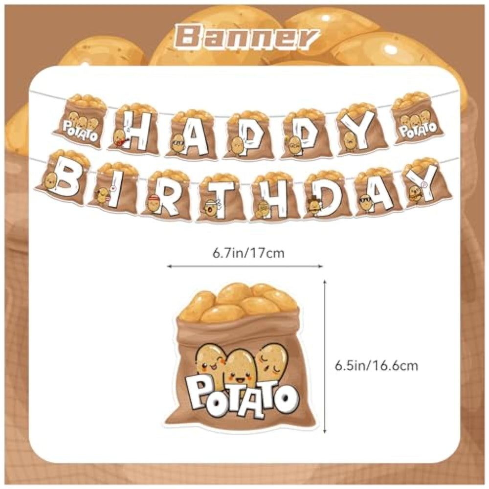 | Potato Party Supplies: You Will Get 1 Potato Happy Birthday Banner, 1 Potato Happy Birthday Cake Topper, 12 Potato Cupcake Toppers, 18 Potato Balloons ( 6 Brown, 6 Yellow, 6 White), 1 Ribbon. | | Premium Material: Potato Happy Birthday Banner And Potato Cake Decorations Are Made Of Thick Cardboard, Potato Balloons Are Made Of Natural Latex, Safe And Sturdy, Not Easy To Break Or Fold, Safe And Reliable Materials Allow Us To Enjoy The Joy Brought By The Party With Peace Of Mind. | | Unique Design: Our Potato Themed Party Mainly Features Classic Yellow, White, And Brown, With Various Cute Potato Patterns As The Main Elements. The Bright Colors And High-Quality Prints Make The Party Decoration Look More Interesting And Will Definitely Be Welcomed By Everyone. | | Easy To Operate: The Potato Birthday Banner Is Pre-Assembled And Does Not Require Precious Time To Connect. Simply Take It Out Of The Packaging And Hang It In The Desired Decorative Position To Complete The Assembly, Which Is Very Simple. | | Occasions: Our Potato Party Decoration Is The Perfect Choice For Potato Birthday Parties, Party Themed Parties, Potato Themed Parties, Baby Showers, Potato Lovers Party And Birthday Parties. It Can Decorate The Party Scene Or Your Room Very Well And Is An Excellent Decorative Item. | |
