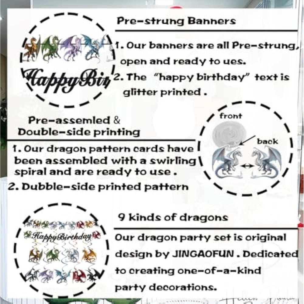 ? Dragon Birthday Party Decorations? Set Includes: 2 Pre-Strung Set Of Dressed Dragon Banners, 9 Pre-Assembled Dragon Swirl Spirals. Our Dragon Set Is Designed By With 9 Kinds Dragons. The Details Are Realistic. Great For Dragon Themed Birthday Party. | ?The Dragon Party Set Is All Pre-Assembled ?1. Our Dragon Banners Are All Pre-Assembled, Open And Ready To Use; 2. Our Dragon Spiral Sets Have Been Pre-Assembled, And They Can Be Hung When They Are Opened. Very Convenient. | ? Illustration Of Pattern Printing ?Our Dragon Spiral Are Both Double-Sided Printed. Banners Are Single-Sided Printed. The Pattern Is Vivid And Clear. Banners And Cards Are Made Of High-Quality Paper, And Swirl Spirals Are Made Of High-Quality Plastic And Can Be Reused. | ?Tips ?Please Gently Open The Spiral Along The Junction Of The Vortex Spiral To Avoid Tearing The Spiral With Excessive Force. | ?Committed To Providing 100% Satisfactory Service? If You Have Any Questions, Please