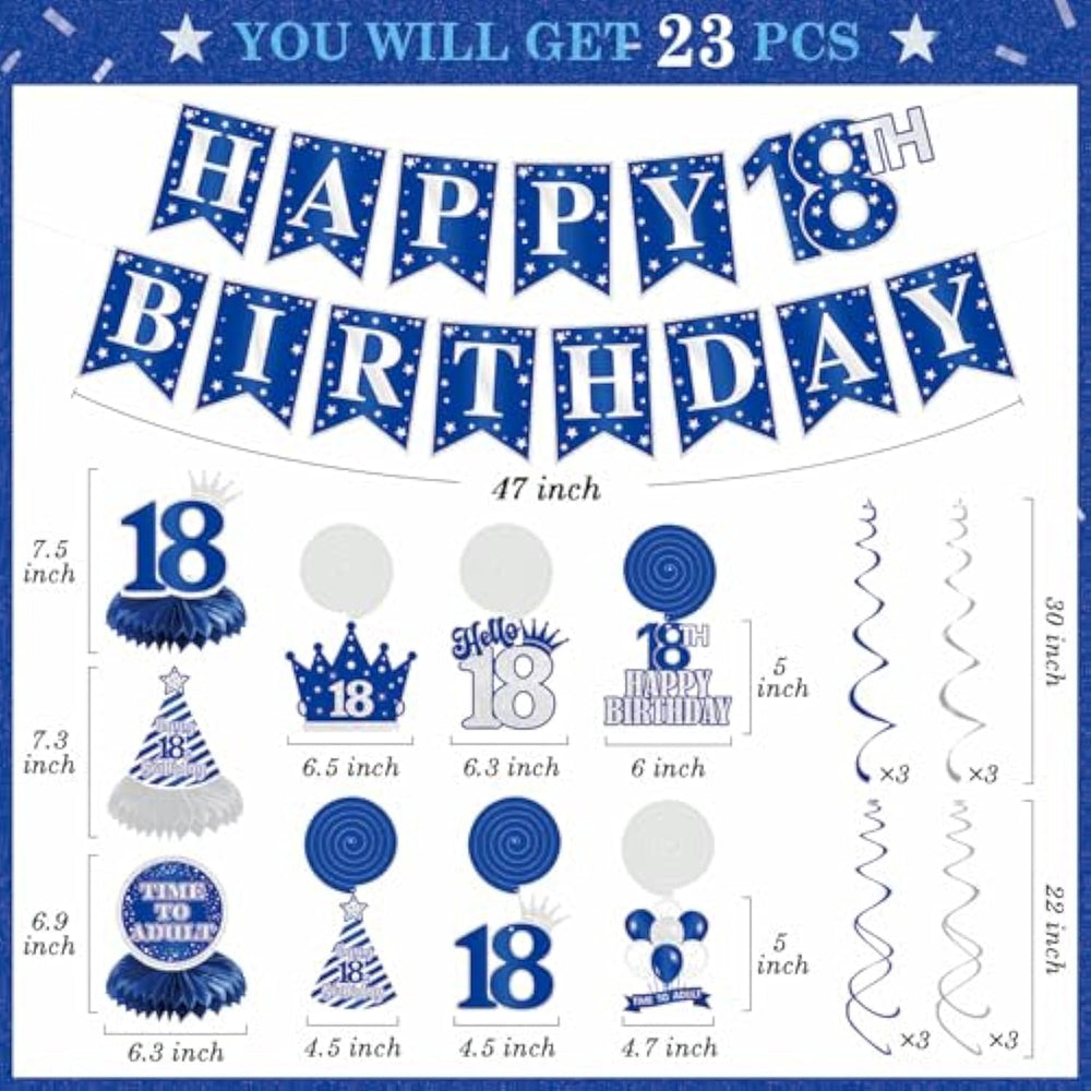 | ?[Complete Party Kit] This 18Th Birthday Decoration Kit Includes A 'Happy 18Th Birthday' Banner, 3 Honeycomb Centerpieces, And 12 Hanging Swirls(6 With Printed Designs, 6 Without Printed Designs), Providing Everything You Need For A Festive And Fun 18Th Birthday. The Banner And Hanging Swirls Come Pre-Assembled, Saving You Time And Effort On Setup. | | ?[Cool And Funny Design] Featuring A Vibrant Blue Theme With Sparkly Details, This Set Is Designed To Be Cool, Funny, And Special, Creating A Joyful And Memorable Atmosphere For Time To Adult 18 Year Old Birthday Celebration. | | ?[Versatile Decor] Whether You Choose To Hang The Banner On The Wall As A Photo Booth Backdrop, Suspend The Hanging Swirls From The Ceiling, Or Use The Honeycomb Centerpieces As Table Decorations, This Eighteen Birthday Decorations Kit Offers Incredible Flexibility In How You Decorate Your Party Space. | | ?[High-Quality Material] The Banner And Honeycomb Centerpieces Are A Stunning Decoration That Is Durable, Reusable, And Made Of High-Quality Cardstock. Metallic Whirls Are Made Of High-Quality Pe Material. This Kit Is Great Quality And Can Be Used Again. | | ?[Memorable Parties] Create A Festive And Unforgettable Ambiance With This Blue 18 Birthday Party Decoration Set. Perfect For Various Party Setups, It S A Memorable And Enjoyable Birthday Party That Mens Will Love. | |