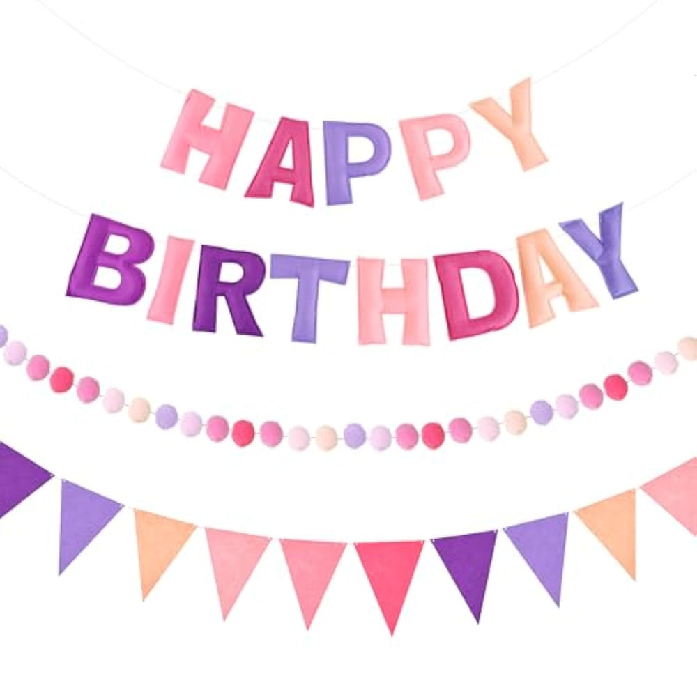 | Felt | | ??[No Assembly Required] Package Includes Felt Happy Birthday Banner, Felt Ball Garland, Triangle Pennants Banner. Already Pre-Strung, No Assembly Required, Just Take Them Out And Hang Them Up. | | ??[3D Pink And Purple Party Decorations] Felt Happy Birthday Banners Come In Vibrant Pink And Purple Colors, Vivid Hues And Fun Designs. It Creates Great Party Atmosphere And Lights Up Happy Birthday Decor Beautifully! | | ??[Reusable Premium Material] The Happy Birthday Sign Set Is Made Of High Quality Felt Fabric Material, Soft And Durable. Not Easy To Tear Or Fade, You Can Reuse It Undoubtedly. | | ??[Exquisite Handmade] Our Happy Birthday Garlands Are Carefully Handmade, Filled And Stitched Meticulously For 3D Effect. With Adjustable Distance Between The Letters, You Can Remake The Purple And Pink Garland Into Your Favorite Look. | | ??[Wide Application] Felt Birthday Banners Are Lightweight And Easy To Hang. You Can Place Them On Walls, Mantles, Windows, Cars, Stairs, Gardens And Anywhere Indoors And Outdoors To Create A Vibrant And Fun Atmosphere. Whether It'S For Boys, Girls, Adults, Kids, Your Dog, Cat, Or Other One, Our Birthday Banner Are Perfect For Birthday Party Decorations. | |